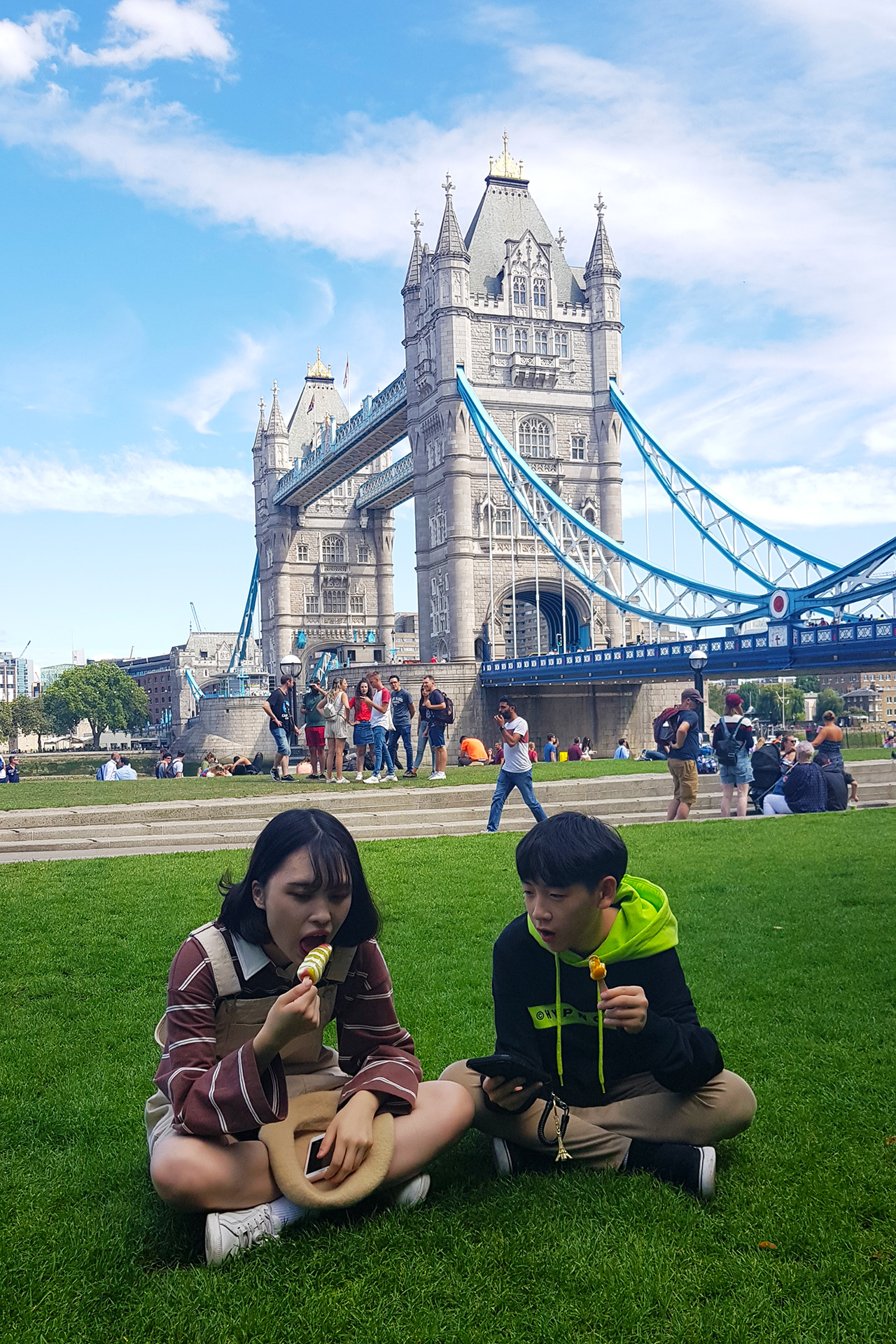 타워브리지를 내려와 시티홀 앞에 있는 공원. 파란하늘을 배경으로 웅장한 모습의 타워브리지가 장관이었다. 많은 사람들이 이 공원에서 햇볕도 쬐고 나들이를 나온 모습이다.