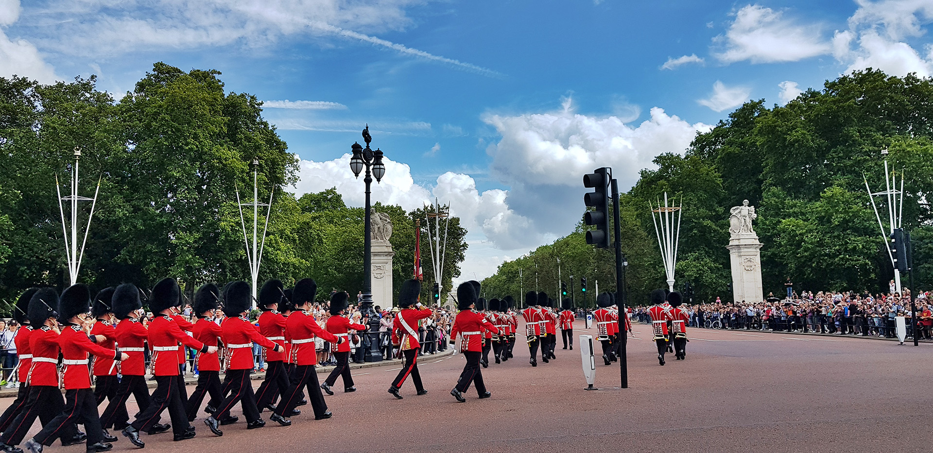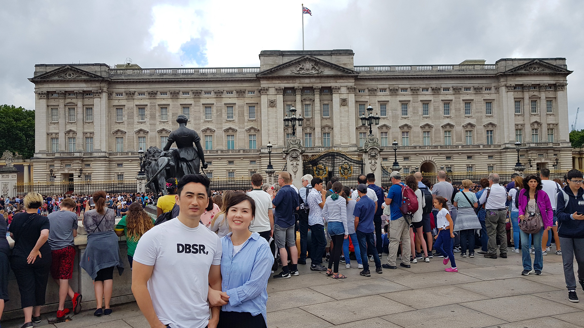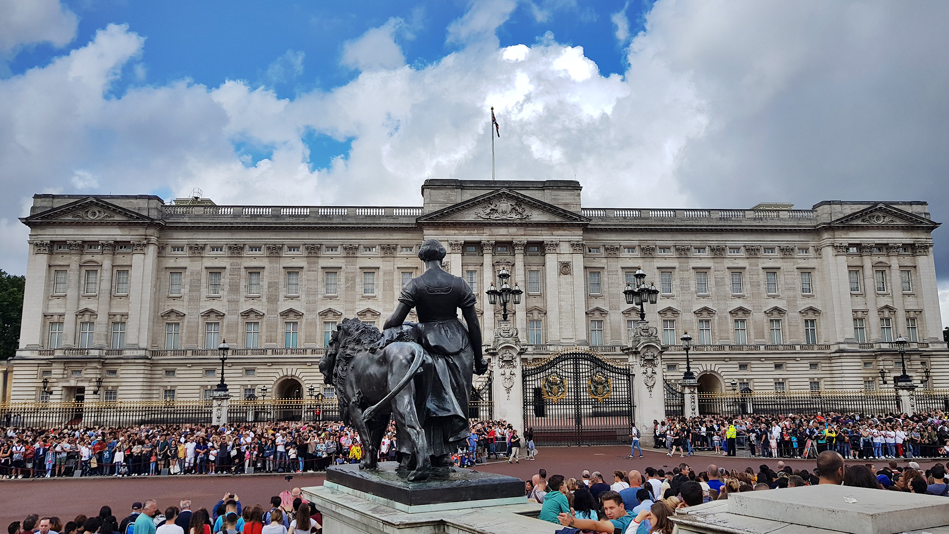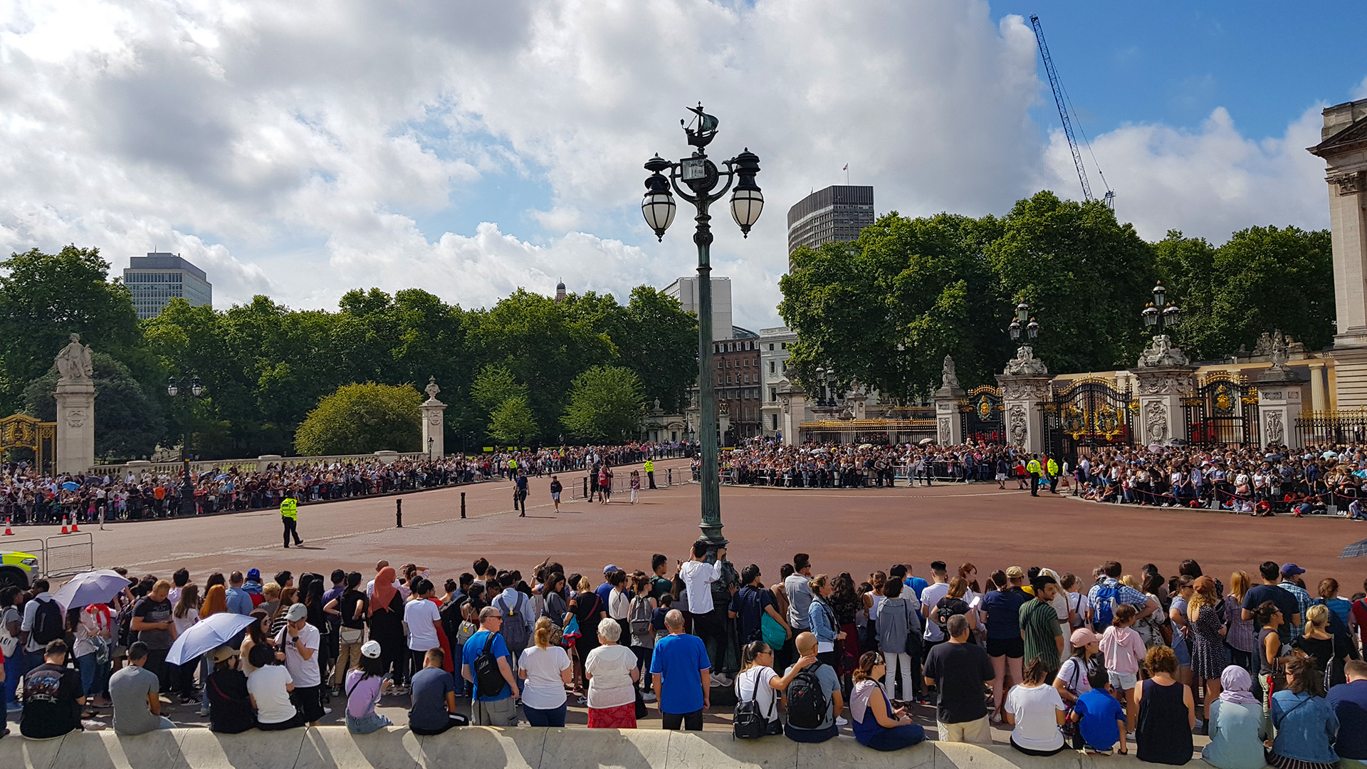 버킹엄궁전 도착. 일주일에 정해진 요일에 하는데, 런던 여행일정중 금요일 이날이 11시에 근위병 교대식이 열리는 날이었다. 교대식을 보러 오는 관광객이 워낙 많아서 최소 30분~1시간 전에 자리잡아야 한다는 소문은 들었으나, 10시 즈음에 도착했을때에는 이미 사진에서처럼 사람이 꽉차 있었다.