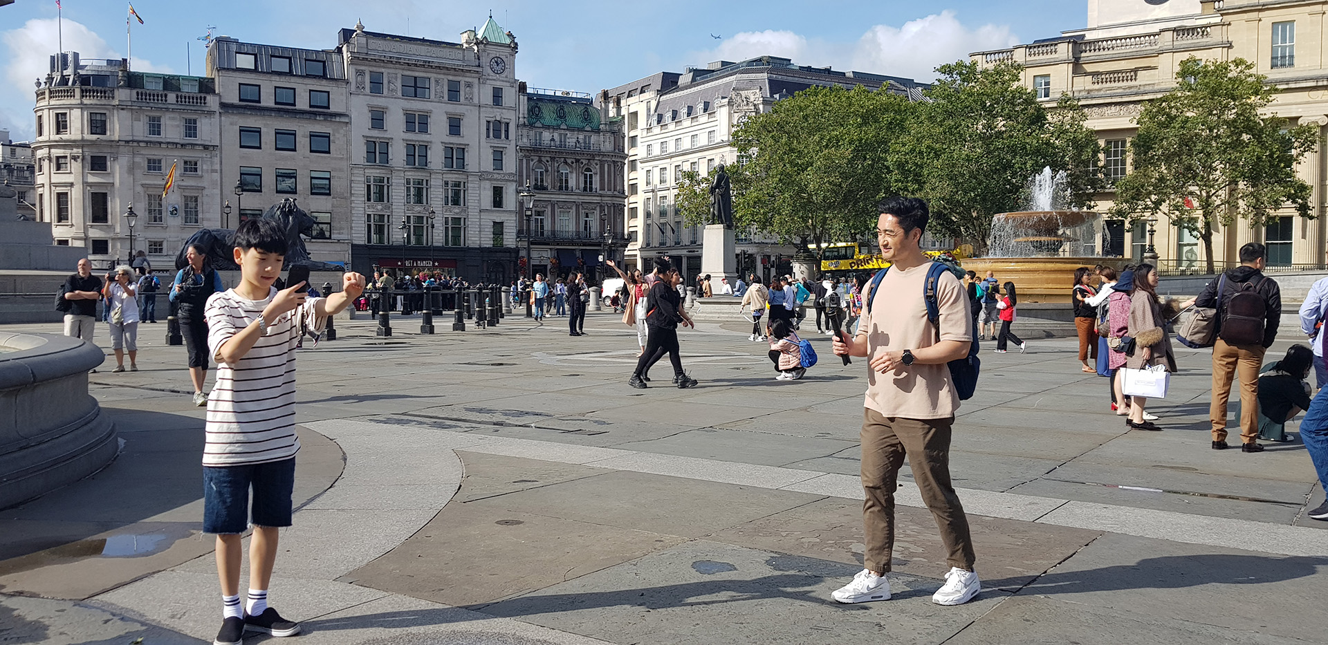 내셔널 갤러리 바깥으로 나오면 거리의 행위 예술가들을 많이 만나볼 수 있다. 대개 막대기 하나를 짚고 서 있는 마술을 선보여 눈길을 끌며, 런더너들에게 버스킹 하면 생각나는 곳으로 꼽힐 만큼 늦은 저녁까지 버스커들로 붐빈다. 또한 이 광장은 정치 연설을 하는 사람들이 많은 것으로도 유명하여, 주말에는 여러 가지 집회가 이루어지는 경우가 많다.