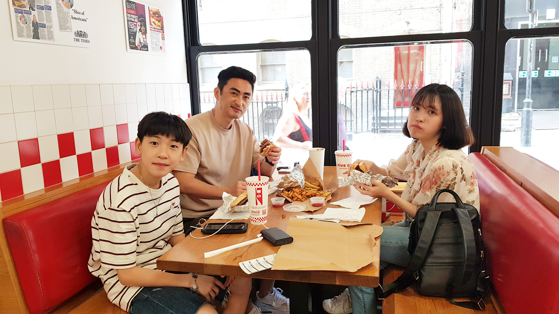 호텔로 돌아가기 위해 Embankment 전철역 가는길에 Five Guys 가 있어 고민없이 들어갔다. 연주엄마가 아이들과 버거 먹는 사진을 찍어줬는데, 내 표정이 ....