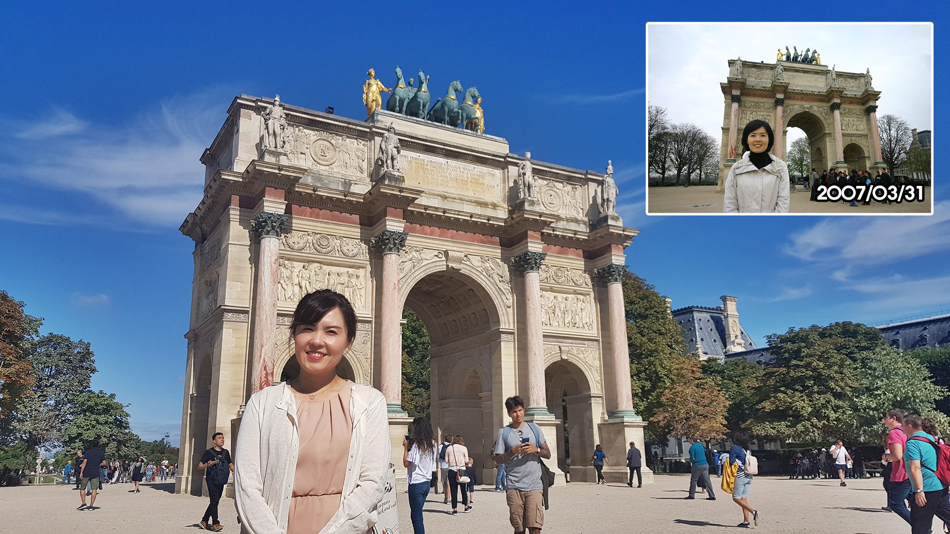 정원을지나서 카루젤 개선문에 도착. 2007년 당시 찍었던 사진을 찾아내서 똑같이 재현. 이제 두번이나 왔는데, 다시 파리에 올일이 있을까 ?