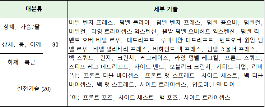 - 실기시험 : 보디빌딩 대회포즈 및 여러 트레이닝 종목에 대한 시범 →