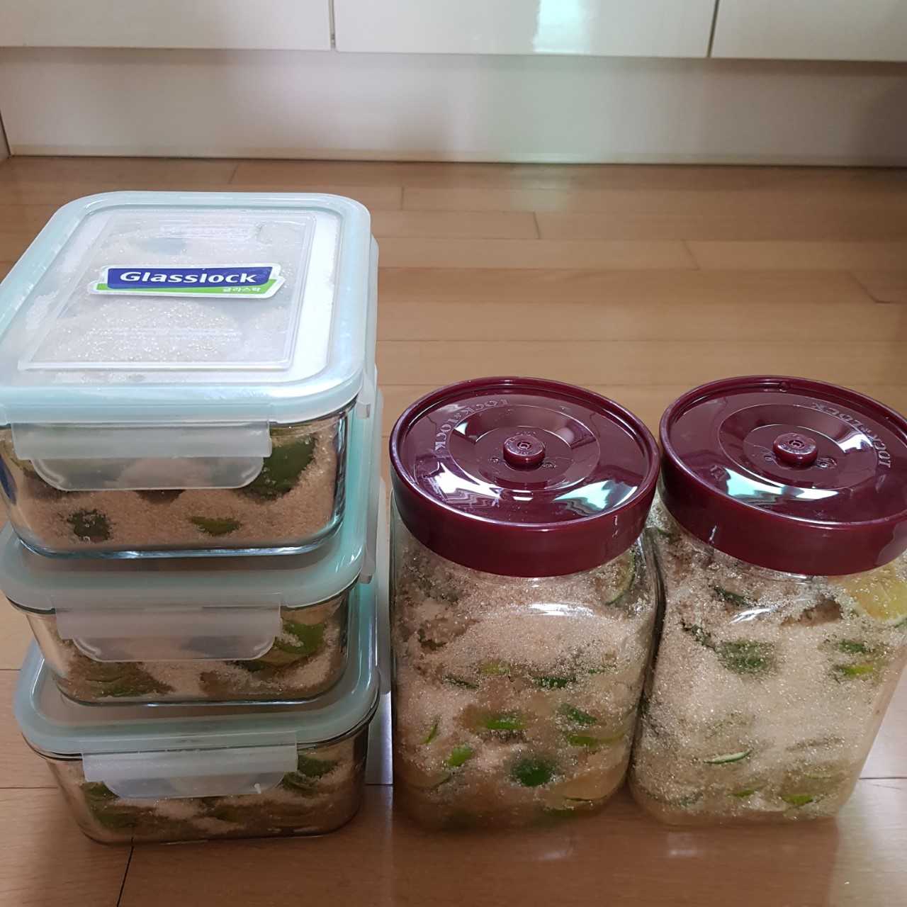 유리병에 청귤과 설탕을 1:1 비율로 켜켜이 번갈아 쌓는다는 느낌으로 넣어준다. 흰설탕을 샀었어야 하는데, 실수하여 갈색설탕을 샀다. 색이 있어 약간 아쉬웠지만, 녹으니 크게 차이도 없다.