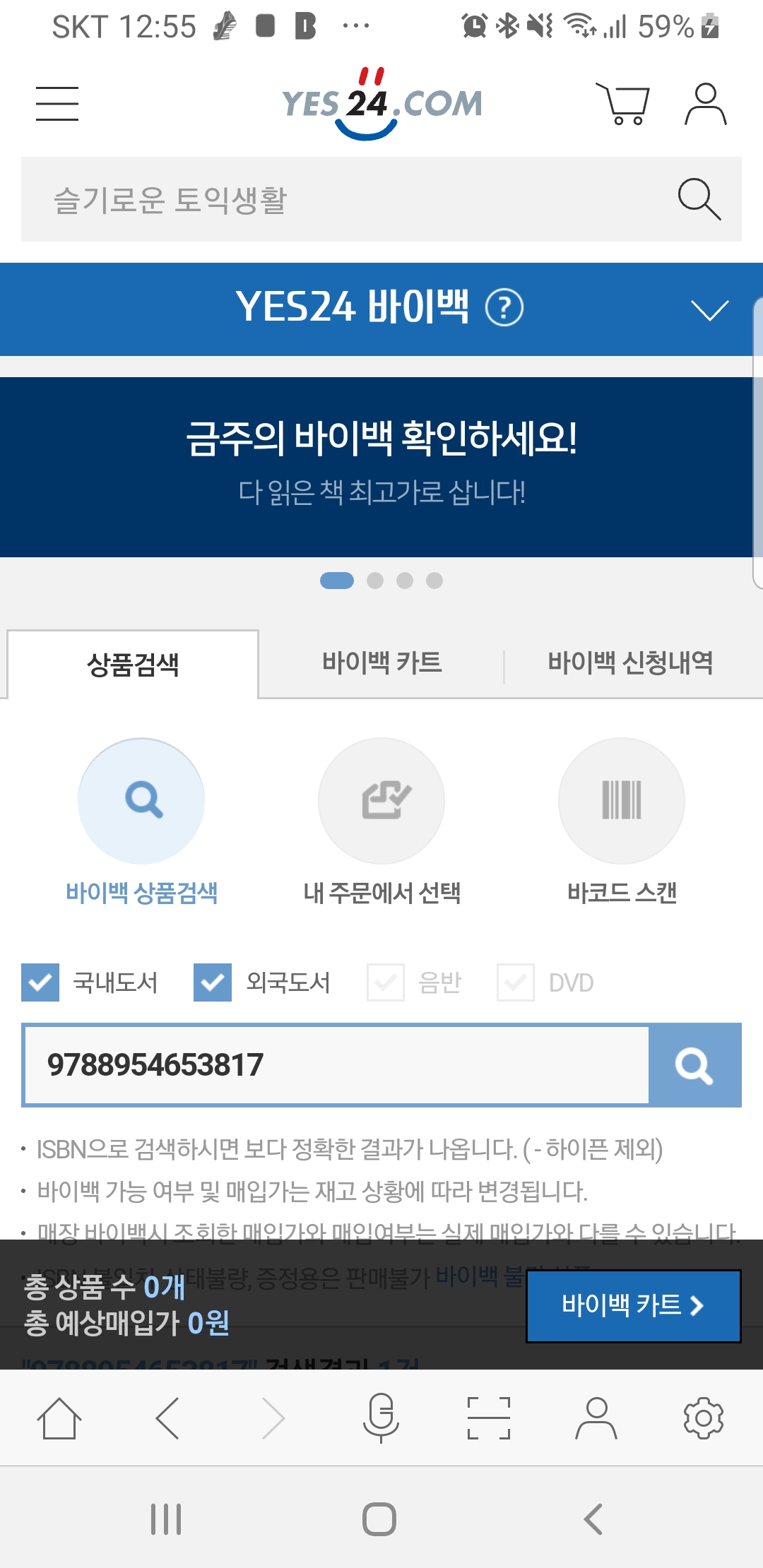 어플 상에서 5권 모두 매입가능으로 확인되어 가져갔으나, 이중 2권만 매입이 가능하다고 한다. 한권은 속지에 물기가 묻어 얼룩이 져서 안된다고 하고, 두 권은 매장재고 초과로 매입이 불가능하단다. 어플상에서 가능하다고 한 것은 YES24 물류창고에서 매입이 가능하다는 얘기고, 매장은 상황에 따라 불가능한 곳도 있을 수 있다. 미리 매장에 전화를 해서 알 수 있는것도 아니고, 결국은 무겁게 들고가서 도로 가져오는 상황이 언제든지 발생할 수 있는 것이었다. 앞으로는 책을 여러권 모아서 물류창고쪽으로 택배로 보내는 것이 나을 듯 싶다.
