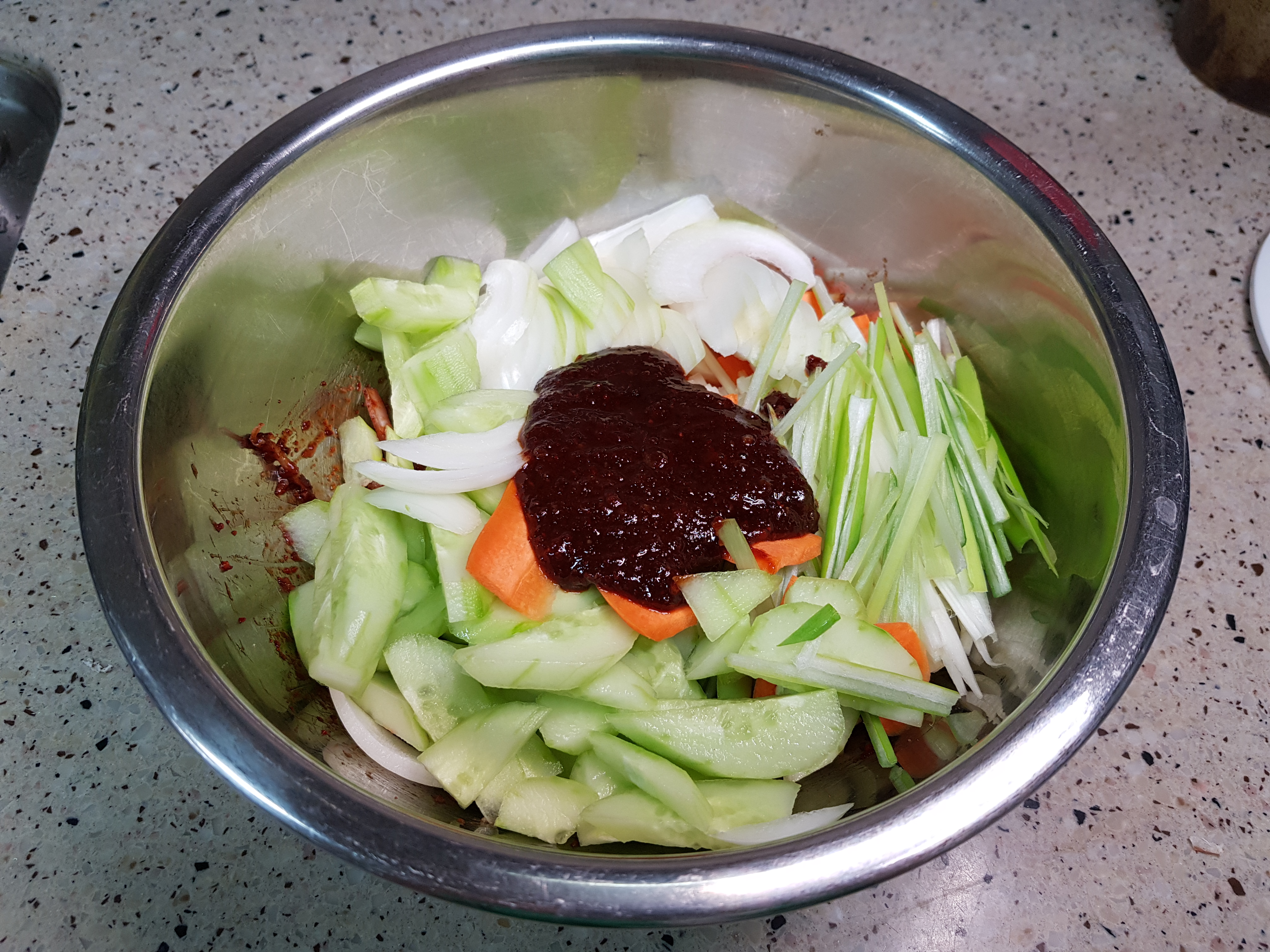 비빔장 : 고춧가루4, 설탕3, 식초3.5, 간장2, 고추장2, 다진마늘1