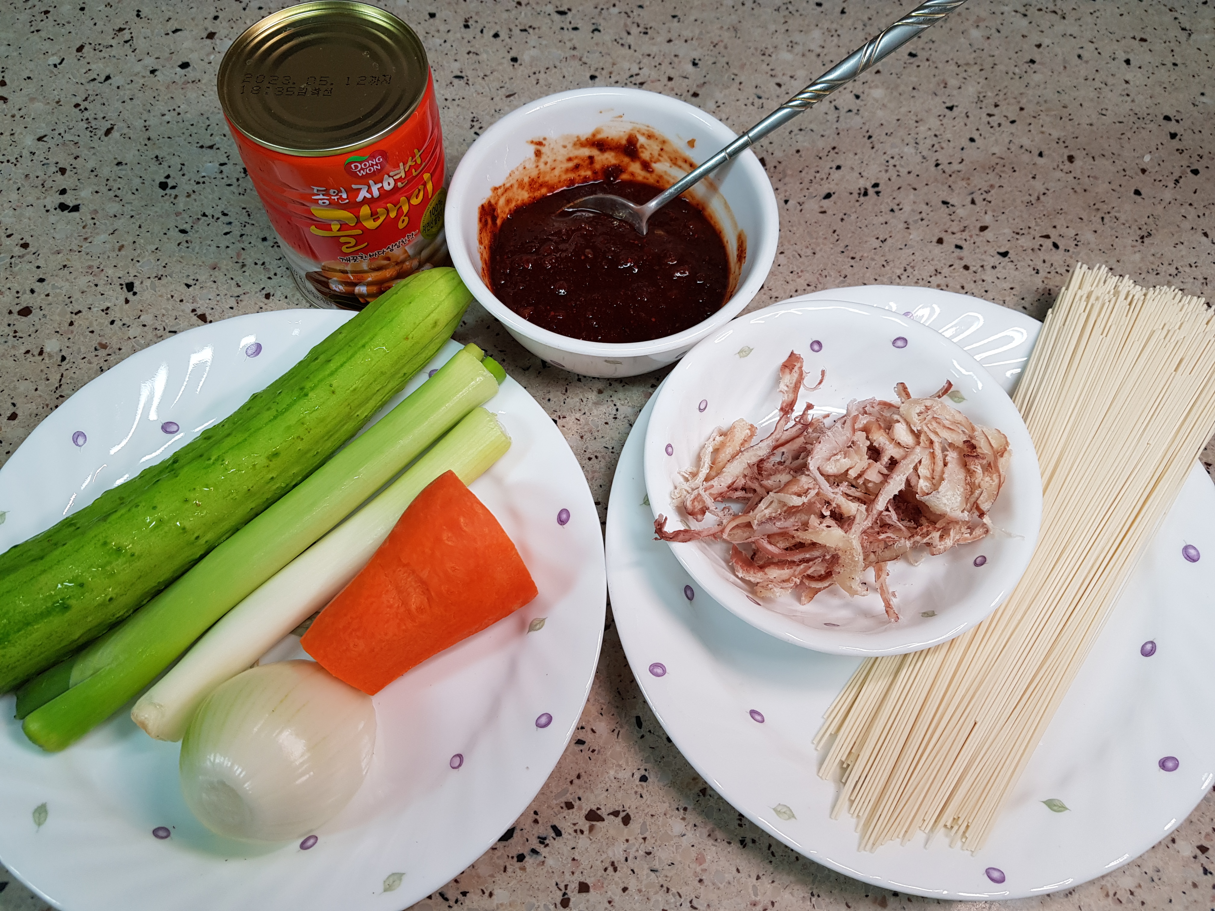 재 료 : 골뱅이 1캔, 오이1개, 당근 1/2개, 양파1/2개, 대파1대, 진미채, 소면, 통깨