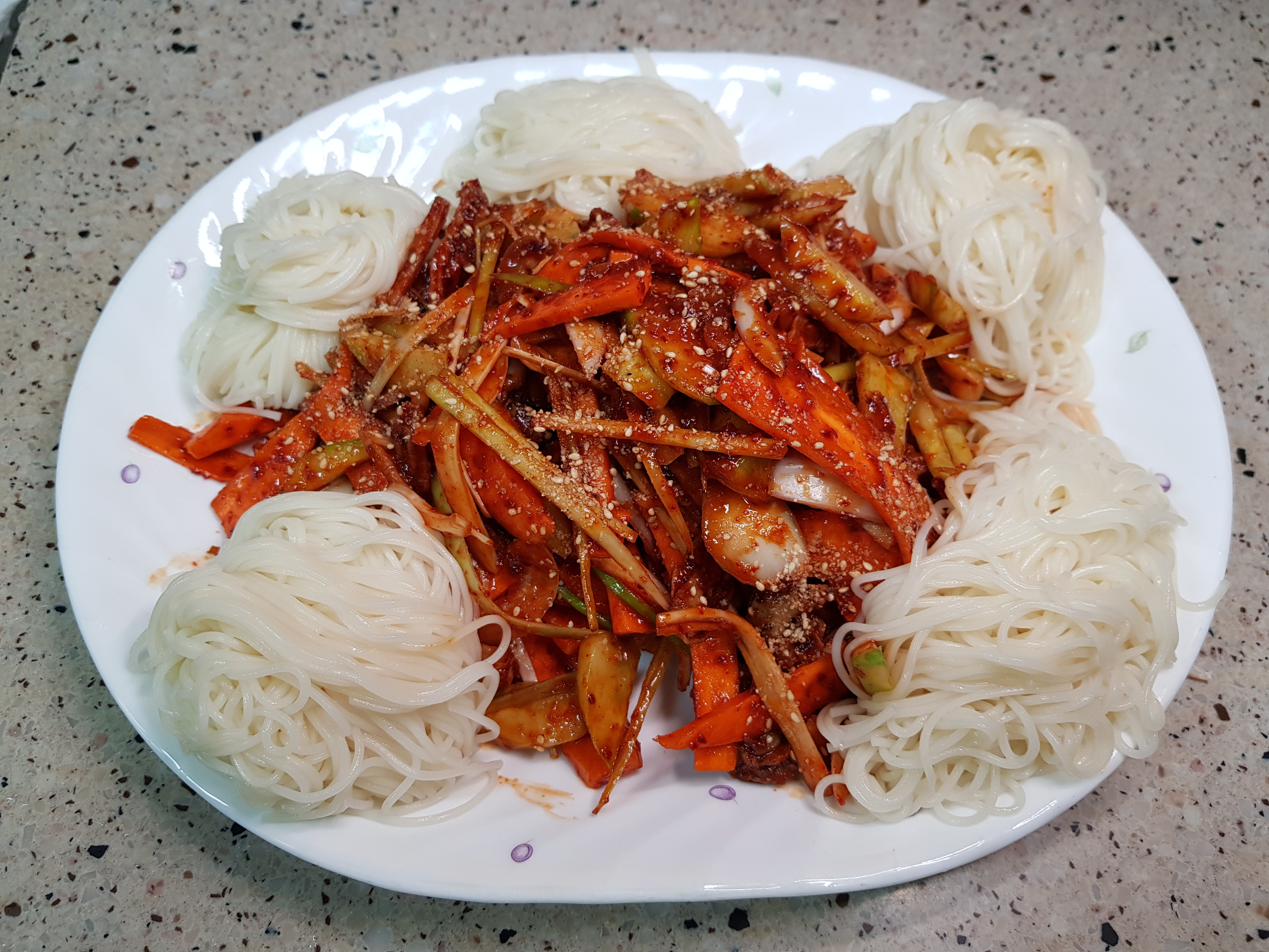 그릇에 옮겨 닮고, 골뱅이 무침 주변에 소면 예쁘게 플레이팅. 마지막으로 통깨 뿌려 마무리~~^^