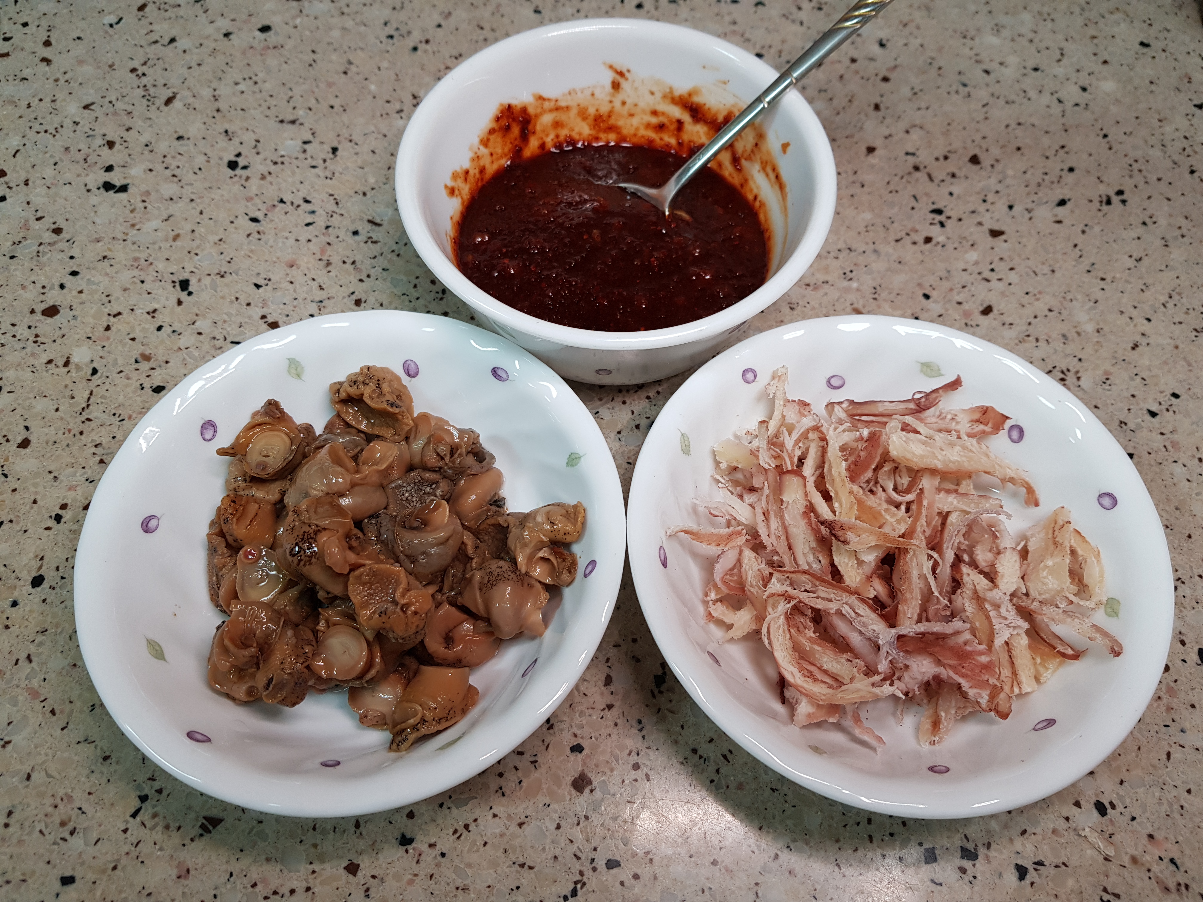 골뱅이가 크면 애들이 한 입에 먹기 맛없다고 잘라달라고 요구해서 반씩 잘라놓는다. 양념장 만들어 미리 준비