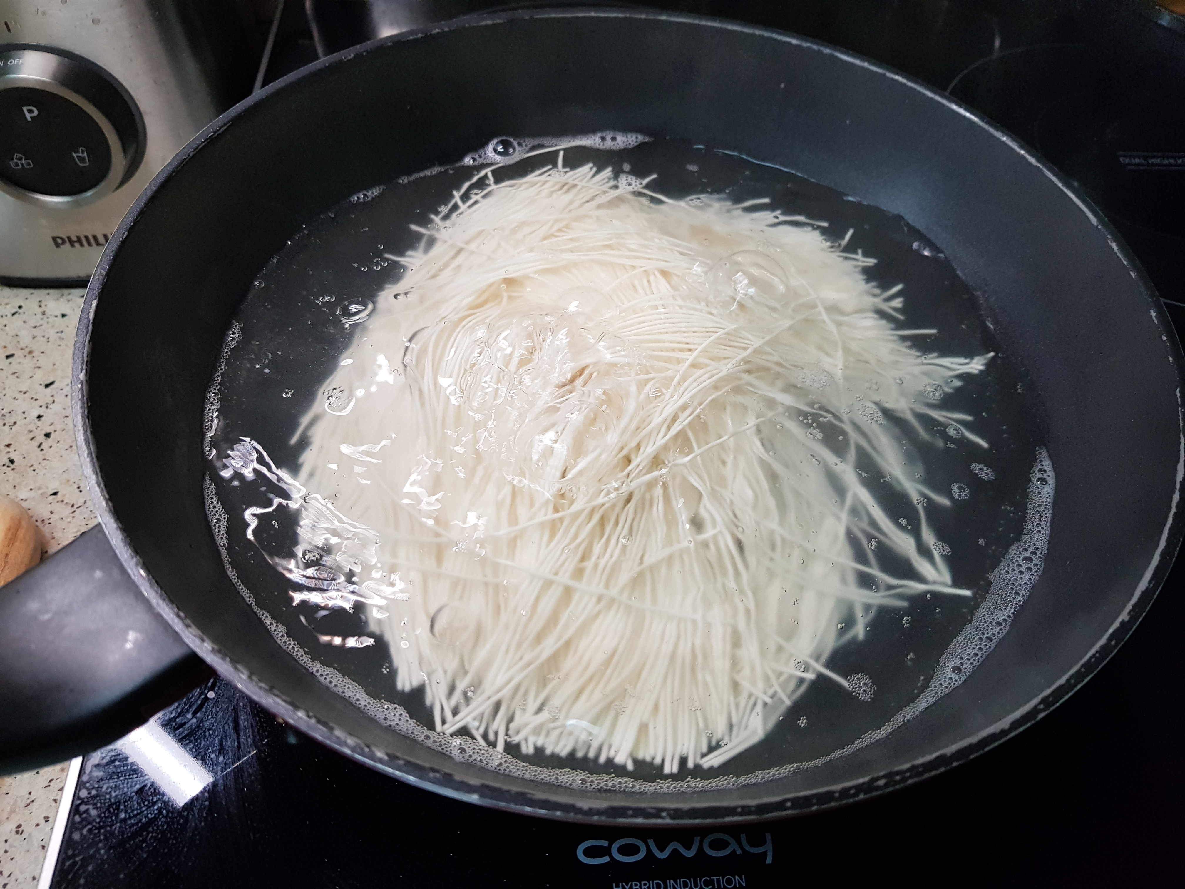 양념 숙성되는 동안 국수 삶기, 부르르 끓어오르면 찬물 한컵 넣어서 소면 탱탱하게 만들기