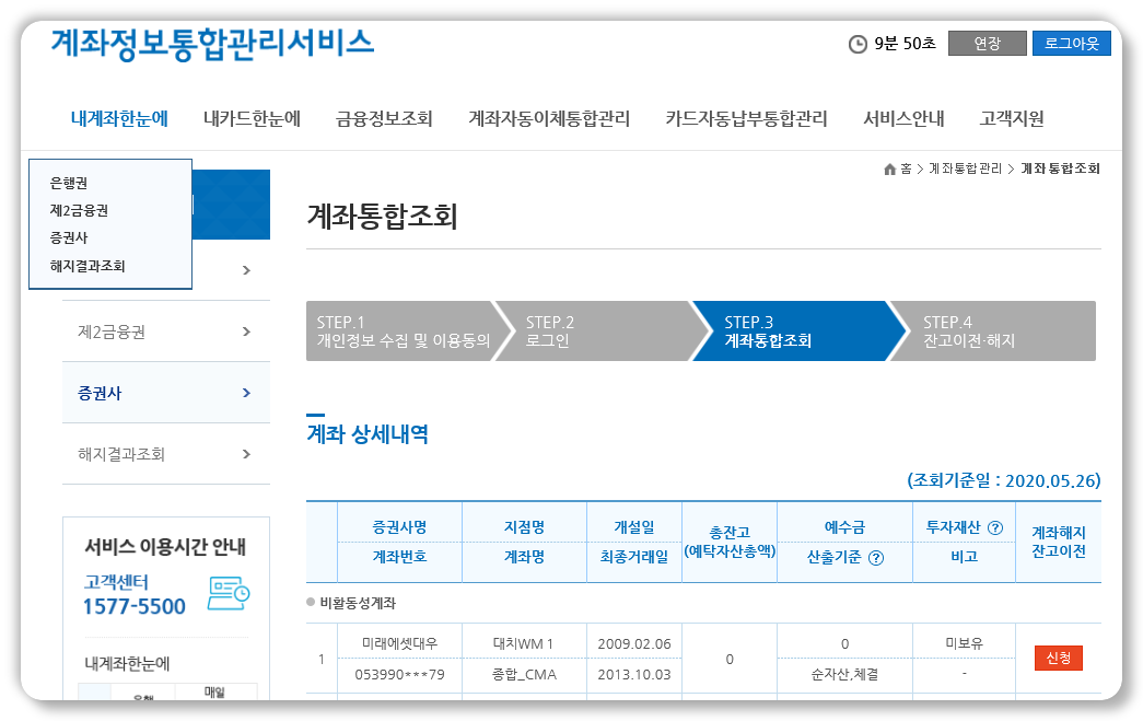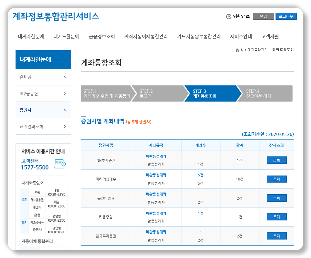 도대체 언제 이렇게 많은 계좌를 만들어 놓았는지 기억도 안난다. 해당증권사의 조회버튼을 누르면 상세내역이 나오고, 잔고를 확인하여 "계좌해지 잔고이전 신청"을 하면 된다.