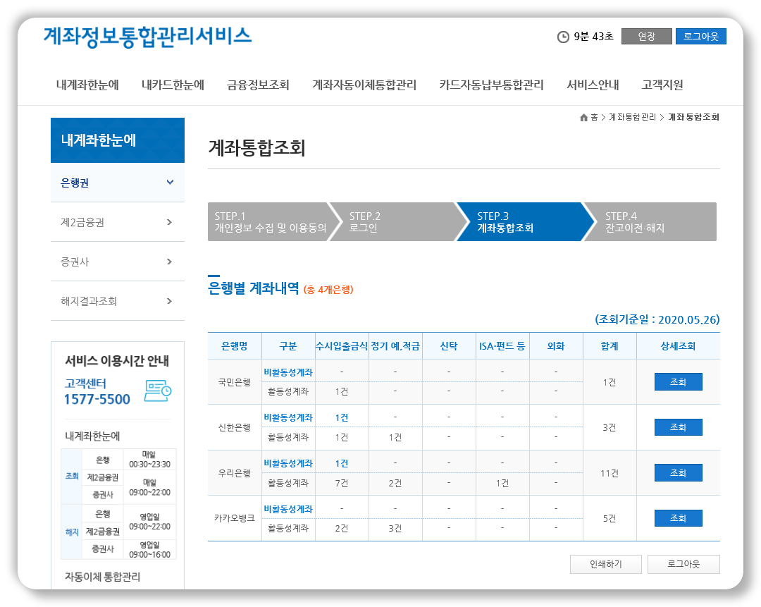 "내계좌한눈에"를 클릭하면 본인인증절차를 거치게 되고, 은행권, 제2금융권, 증권사의 모든 계좌 조회가 가능하다.