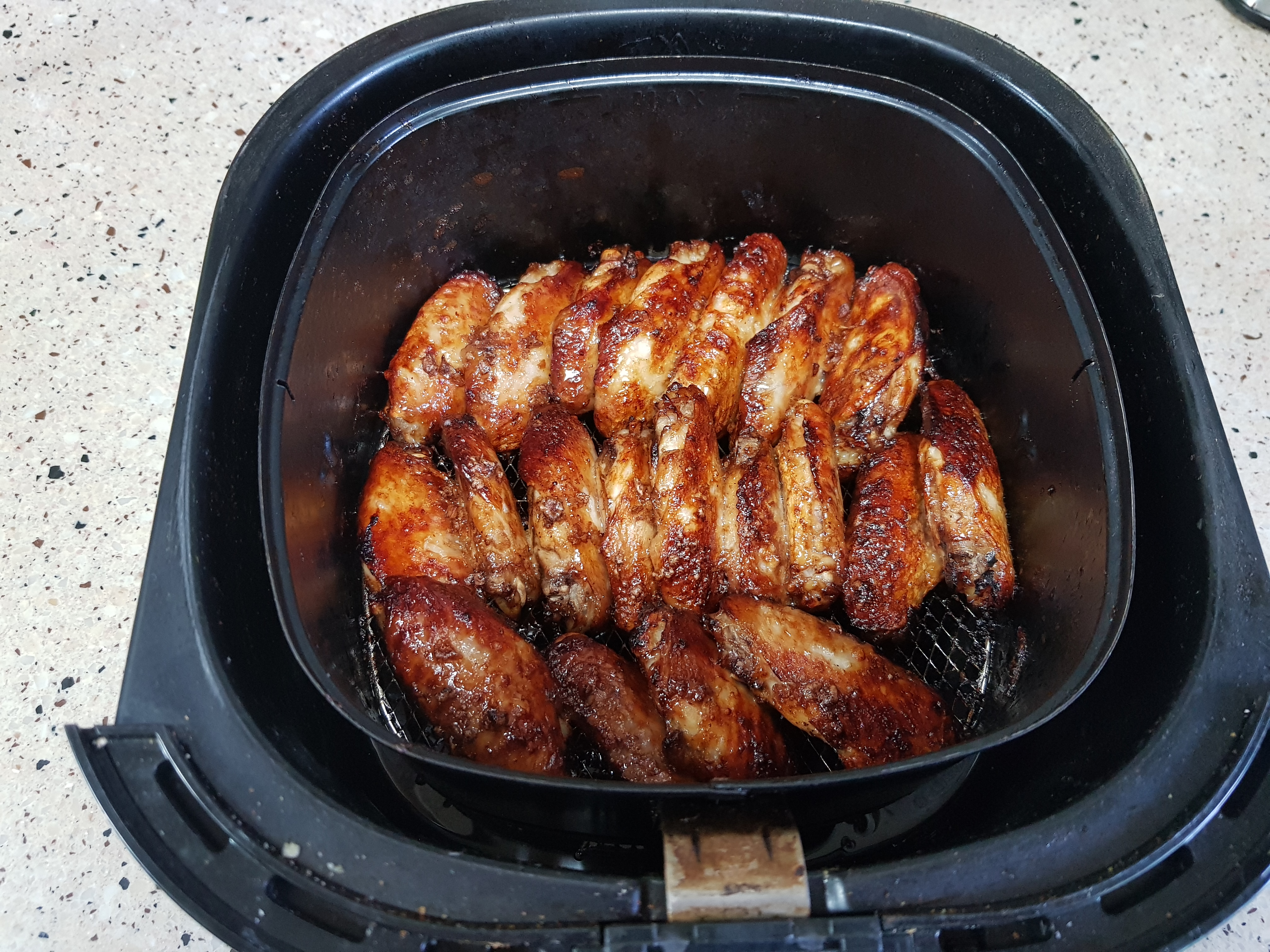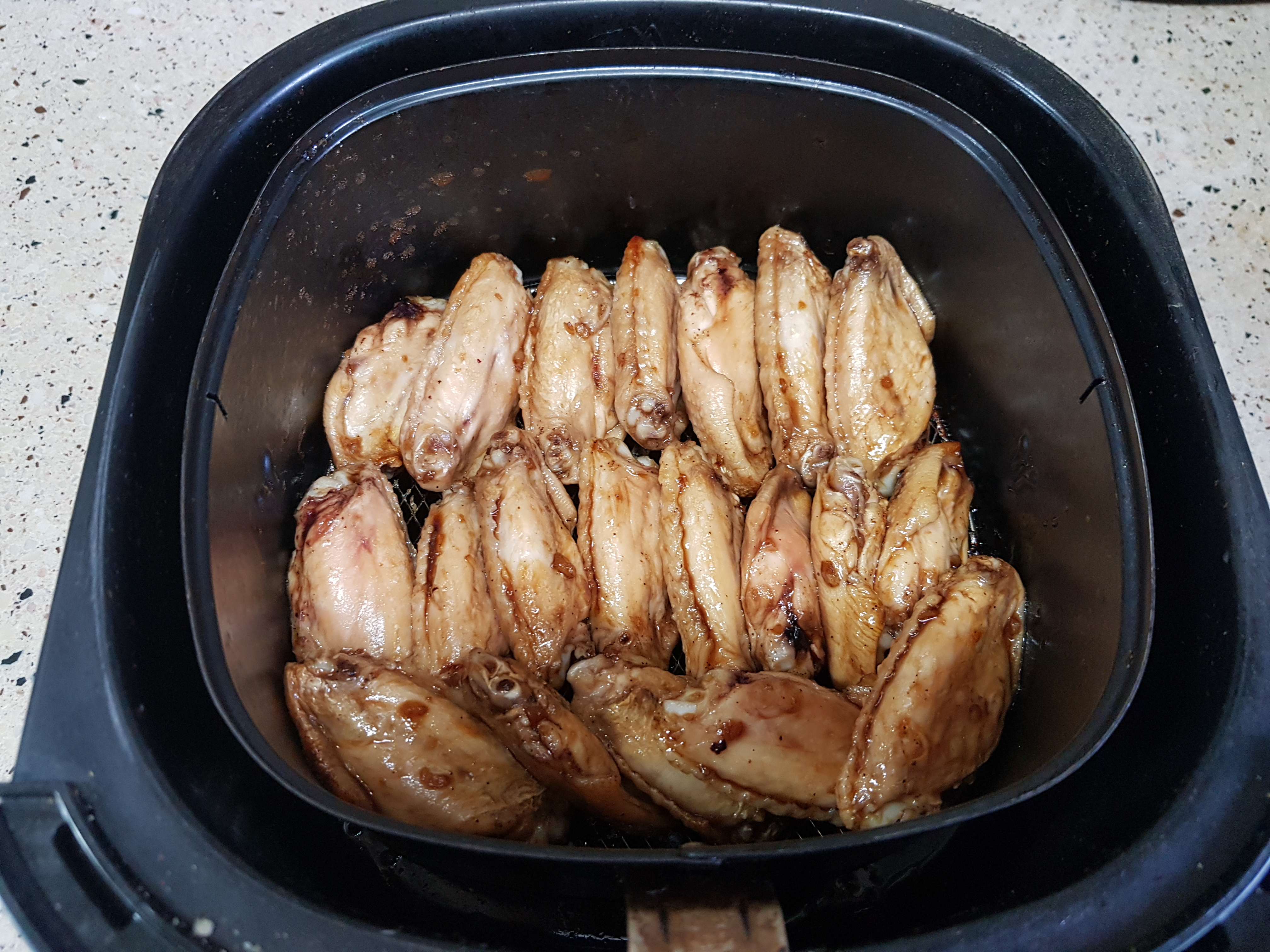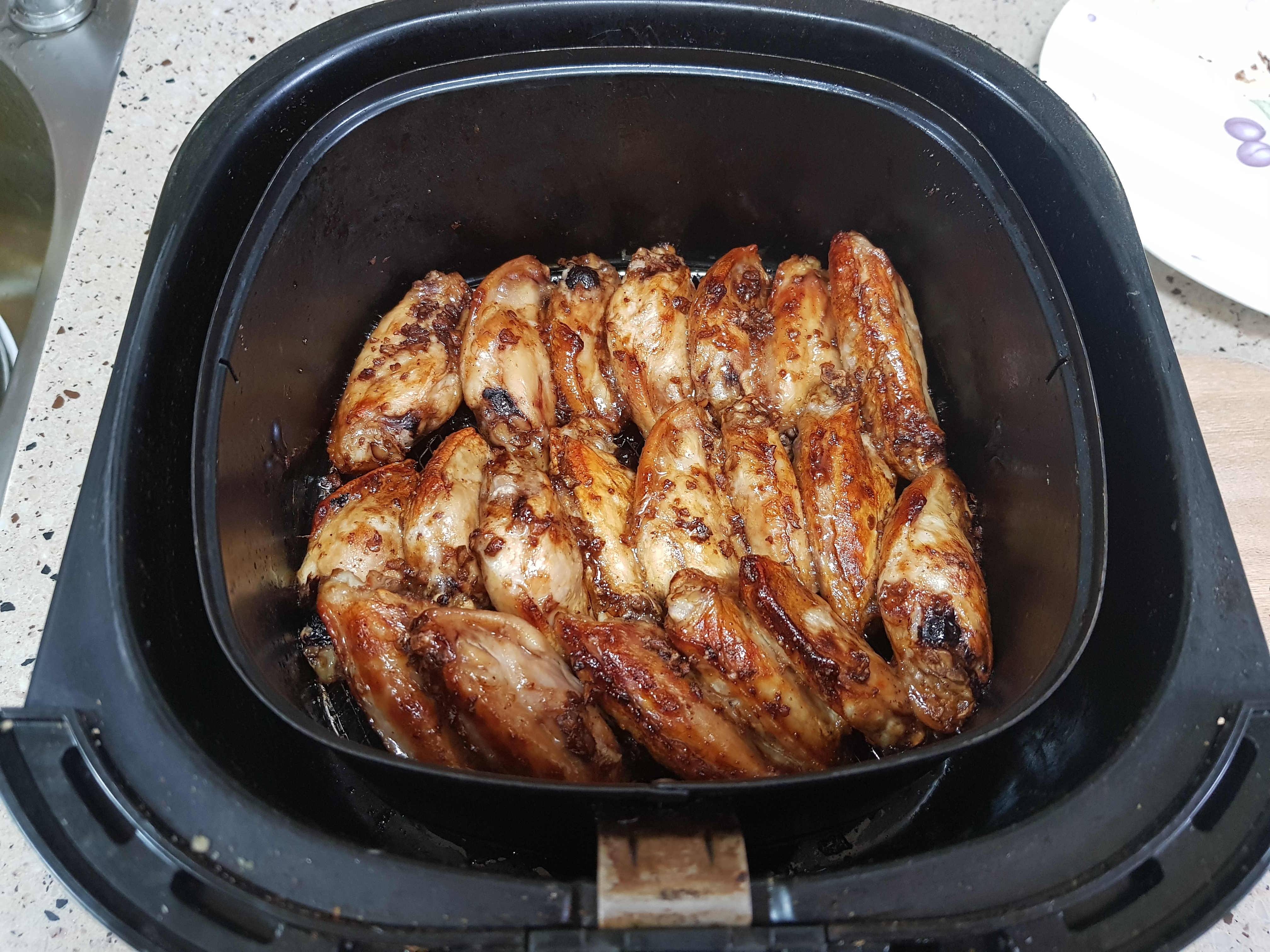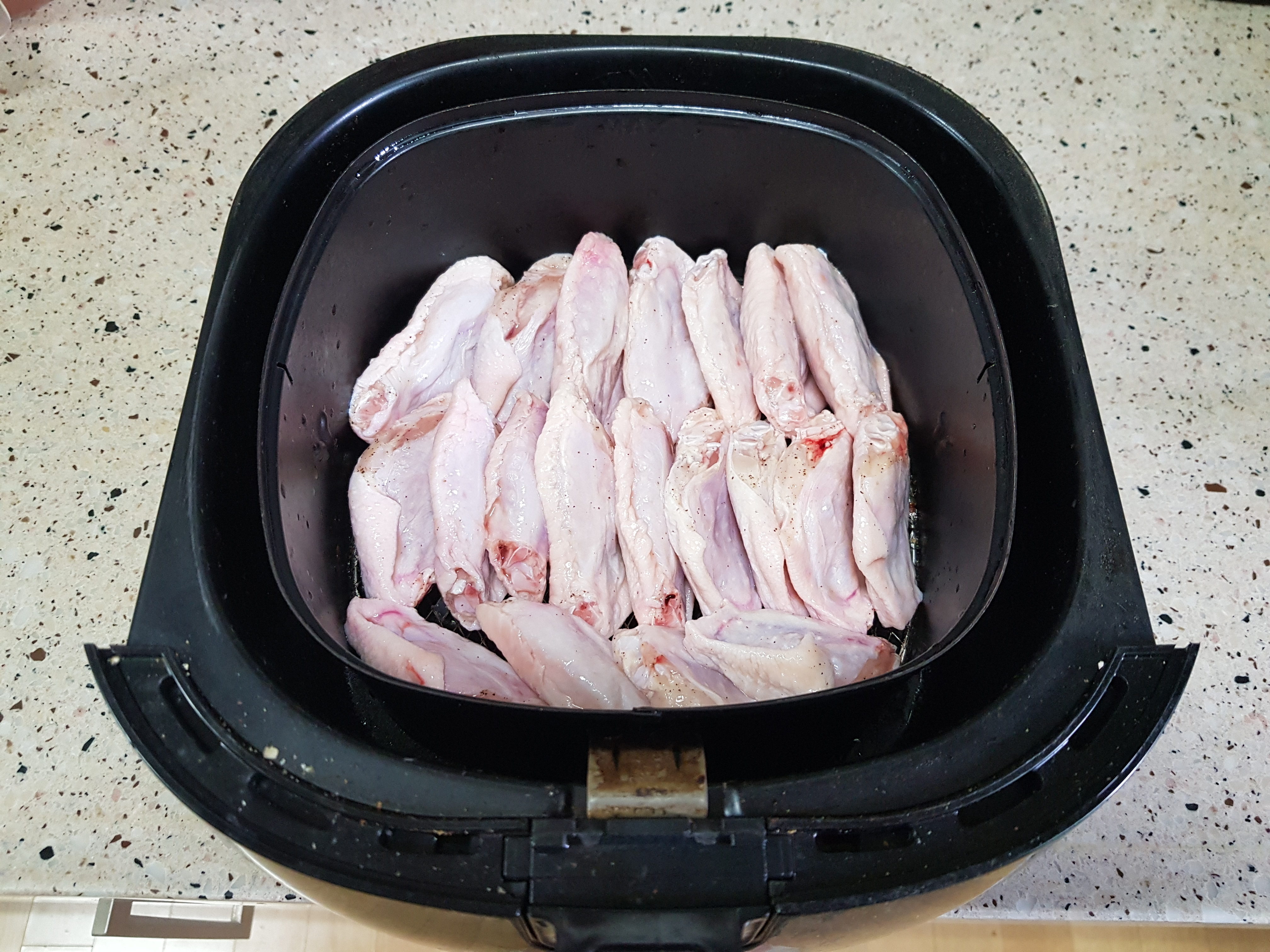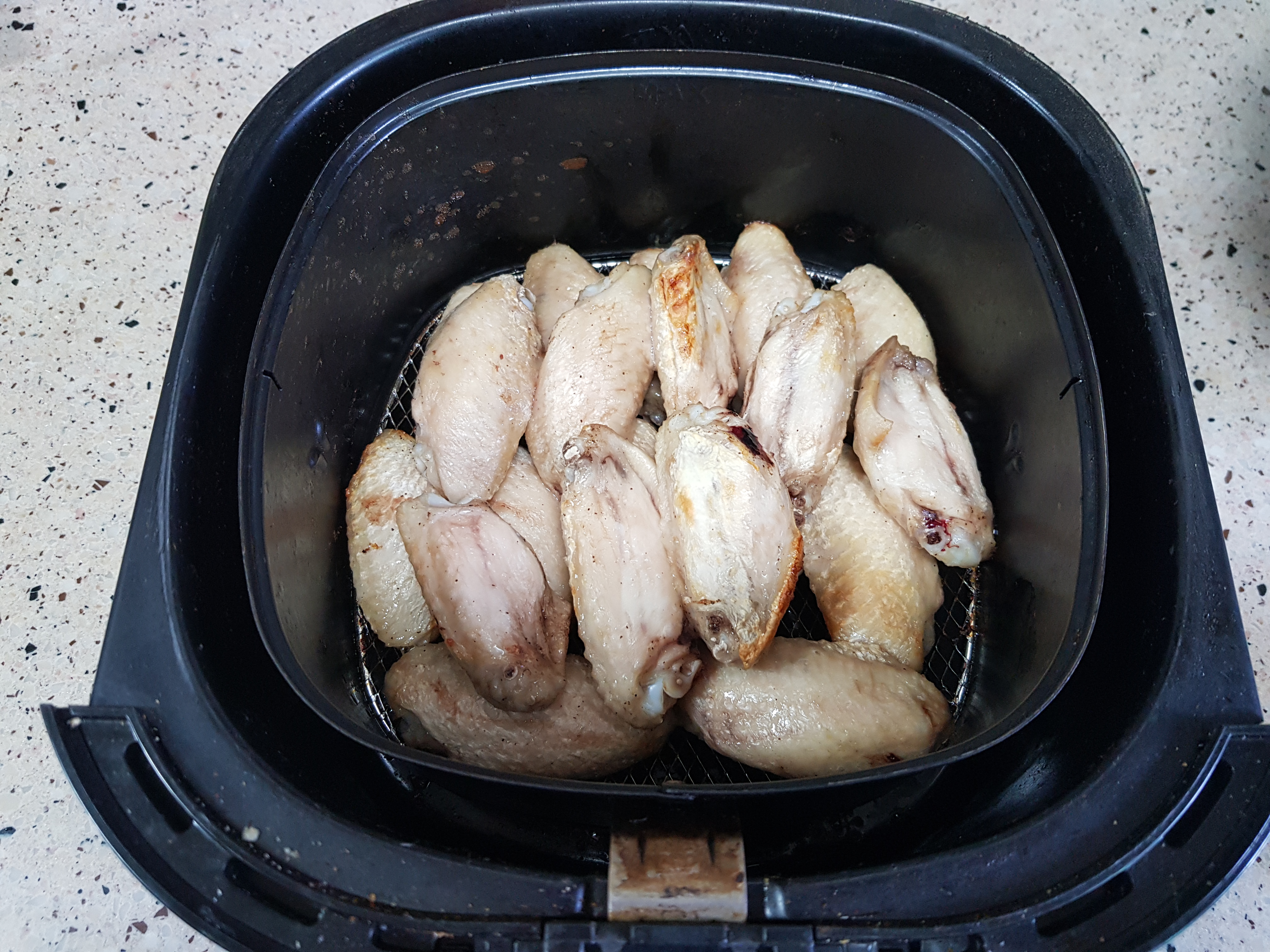 에어프라이어에 간장양념한 닭날개를 가지런히 배열하고 160도에서 10분정도 굽는다.