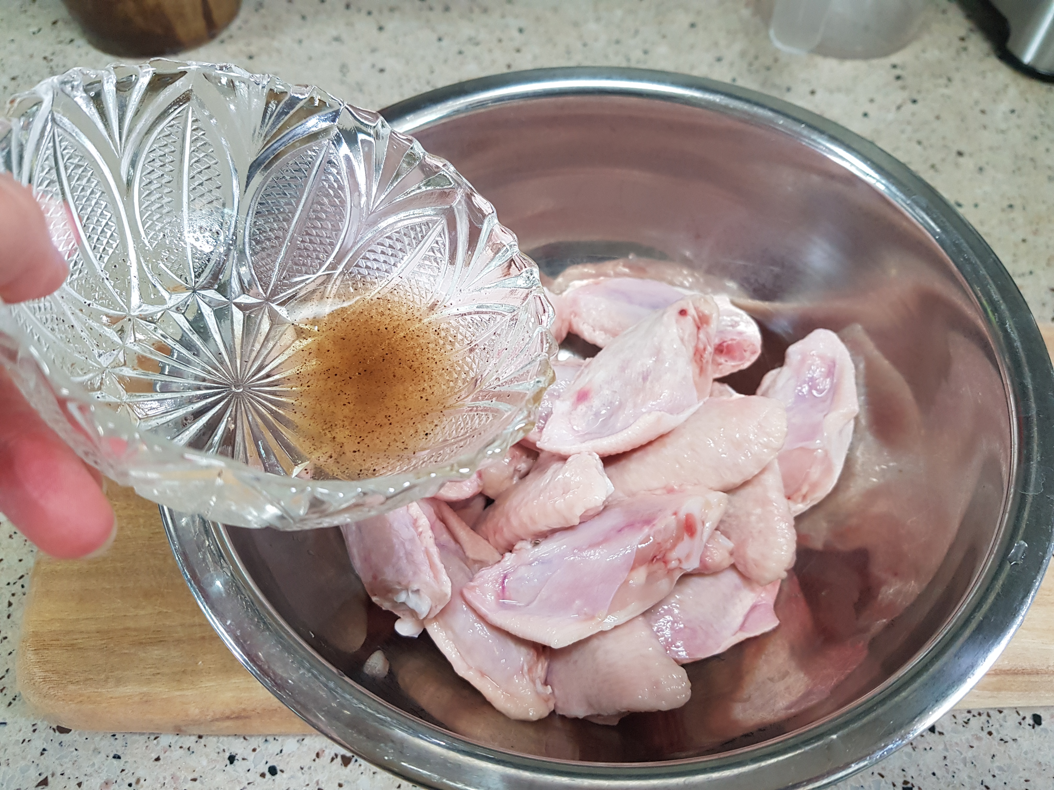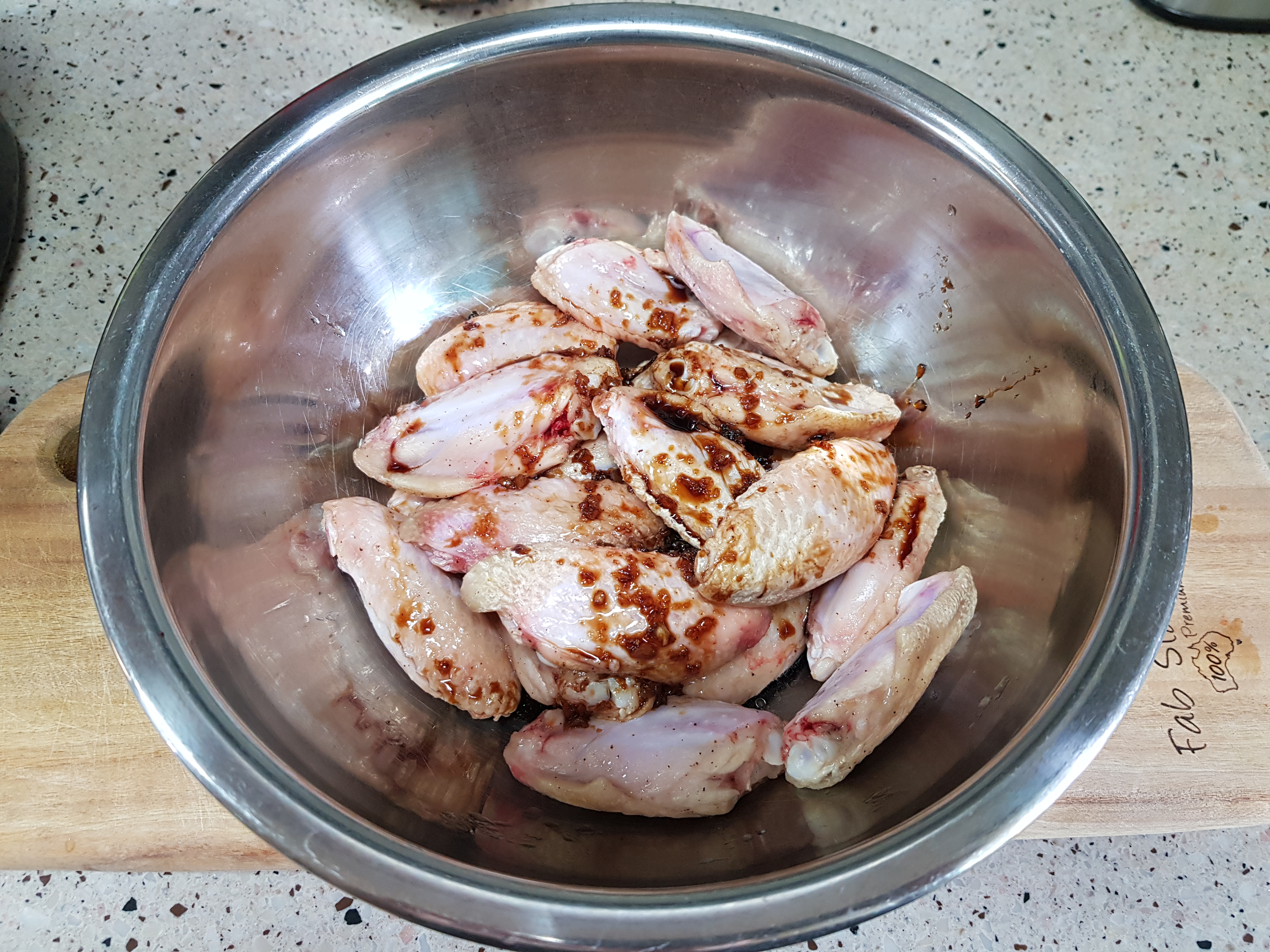큰 볼에 닭을 넣고 간장양념(간장2큰술, 올리고당 2큰술, 맛술 1큰술, 다진마늘 1/2큰술, 후추)을 골고루 묻힌다. 이때 양념을 전부 사용하지 않고 2차 구이를 위해서 조금 남겨 놓는다.