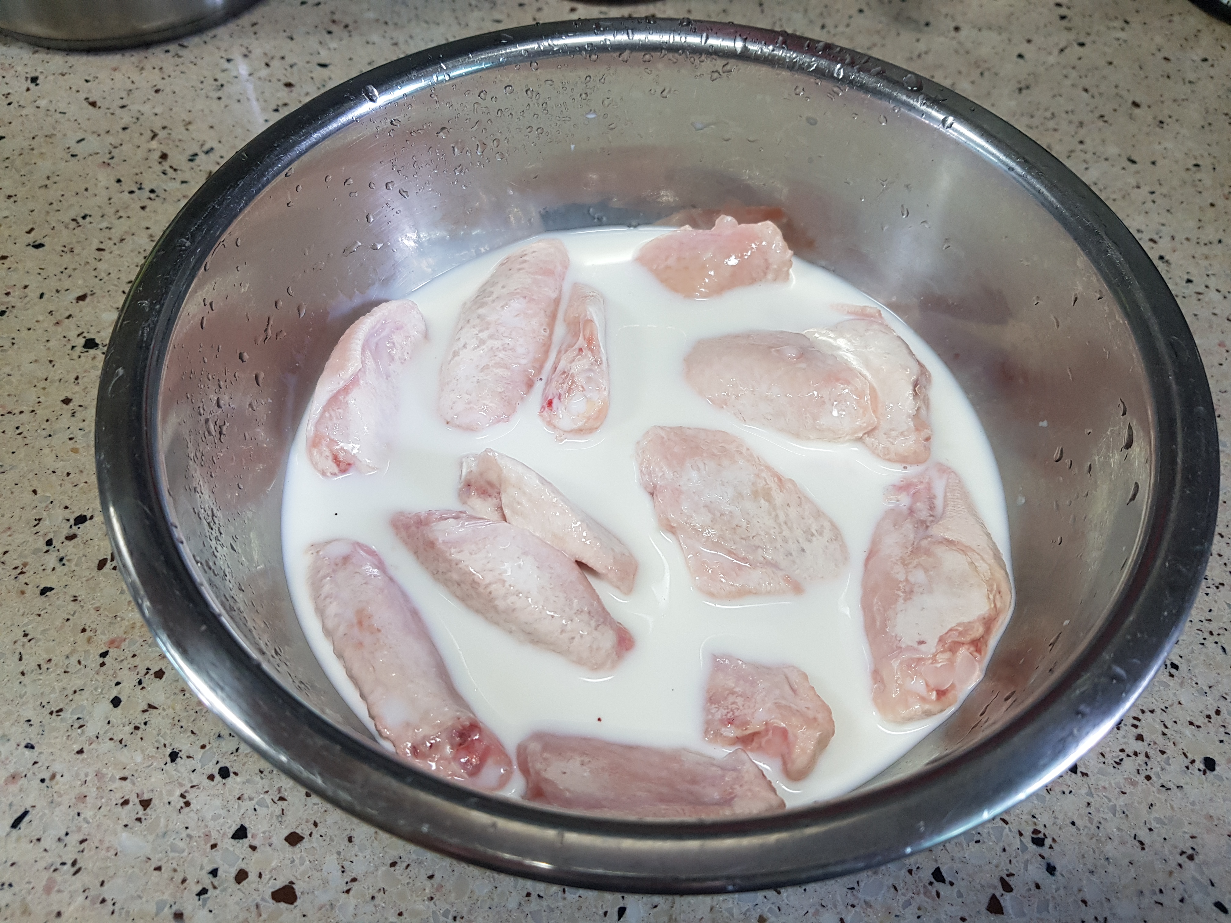 닭 잡내를 제거하기 위해 우유에 30분간 담가 놓는다. 날씨가 더울때는 실온보다는 랩 덮어서 냉장고에 넣어놓는 것이 좋을 것 같다.