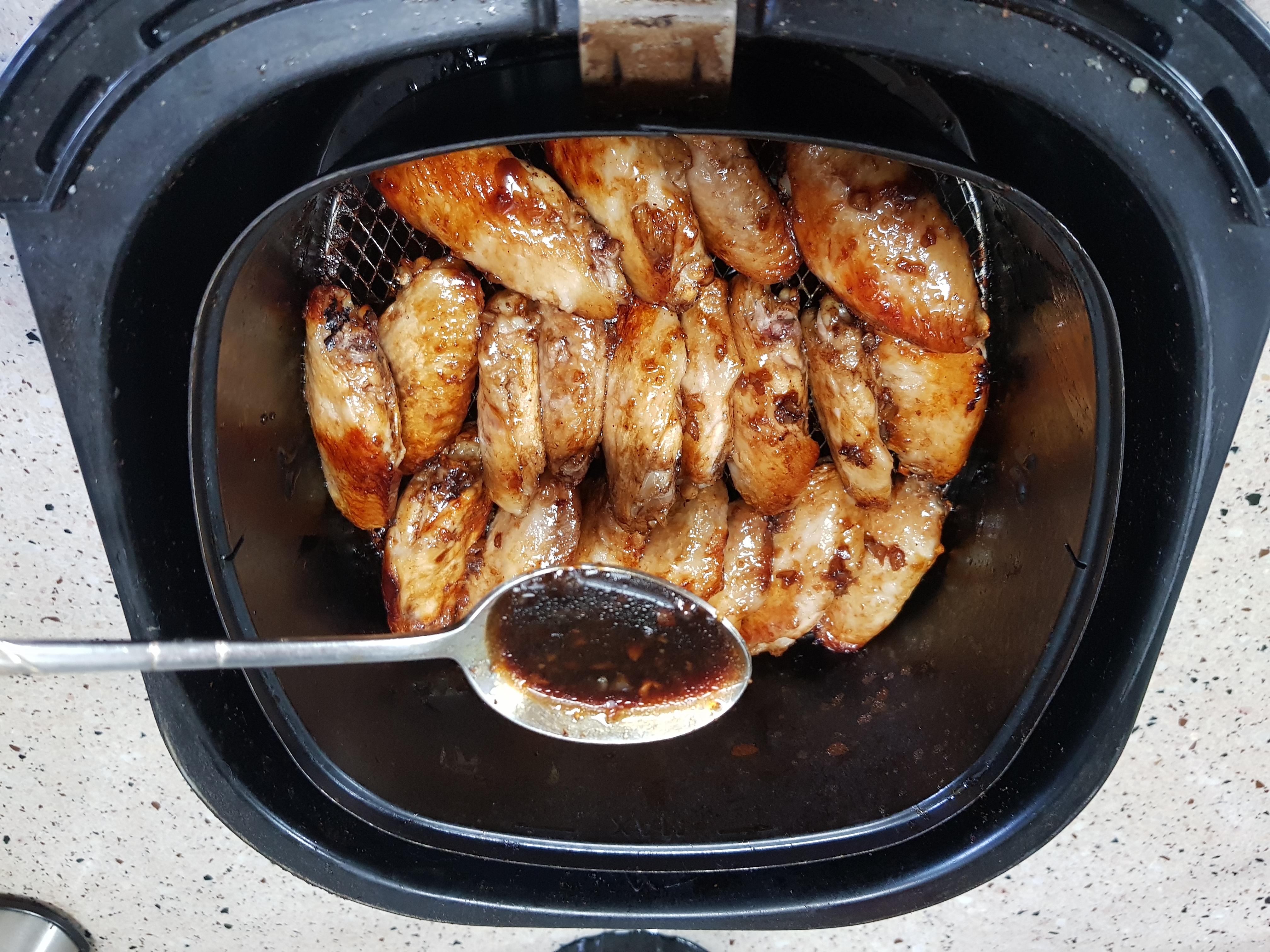 열이 골고루 갈 수 있게 닭날개 놓은 방향을 반대로 뒤집어서 남은 양념을 묻혀 다시 160도에서 10분정도 구워준다.