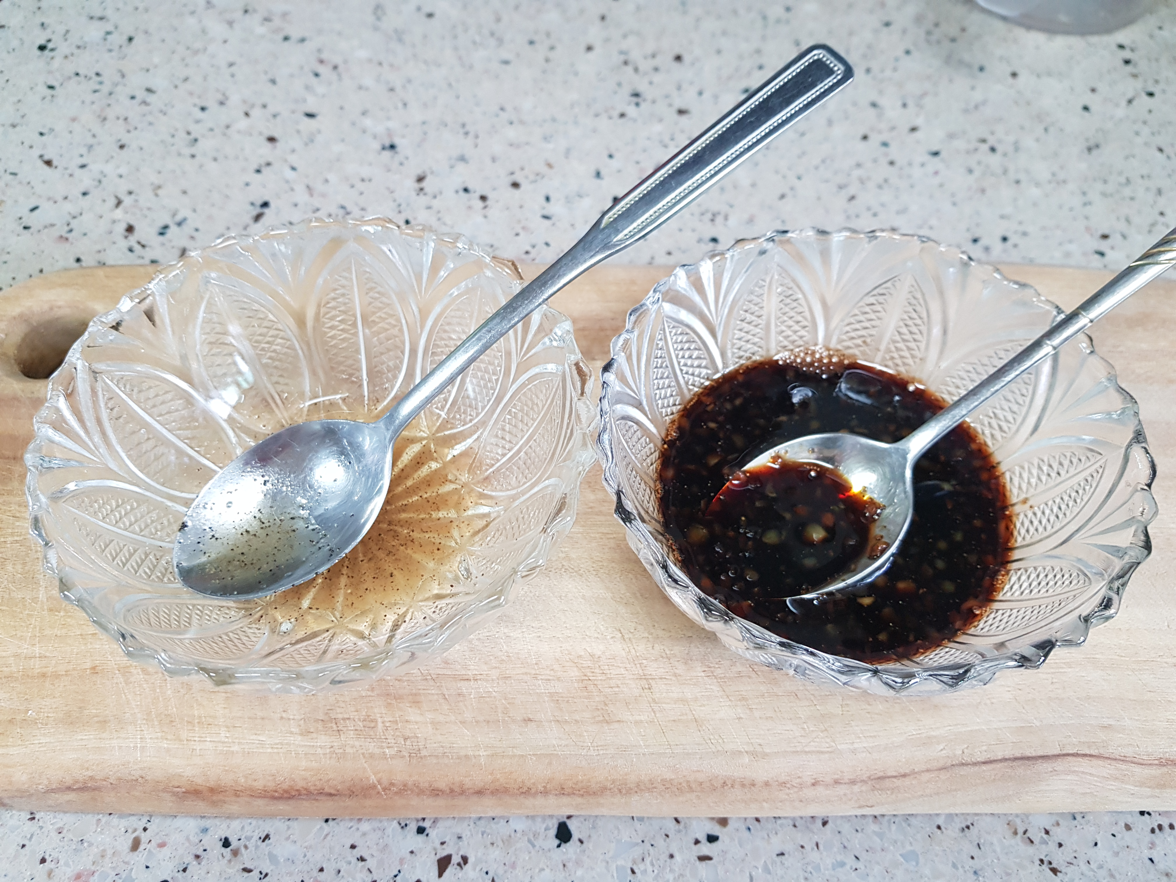 그 사이 양념을 준비한다. 초벌양념(맛술2큰술, 소금 1/4큰술, 후추)과 간장양념(간장2큰술, 올리고당 2큰술, 맛술 1큰술, 다진마늘 1/2큰술, 후추)