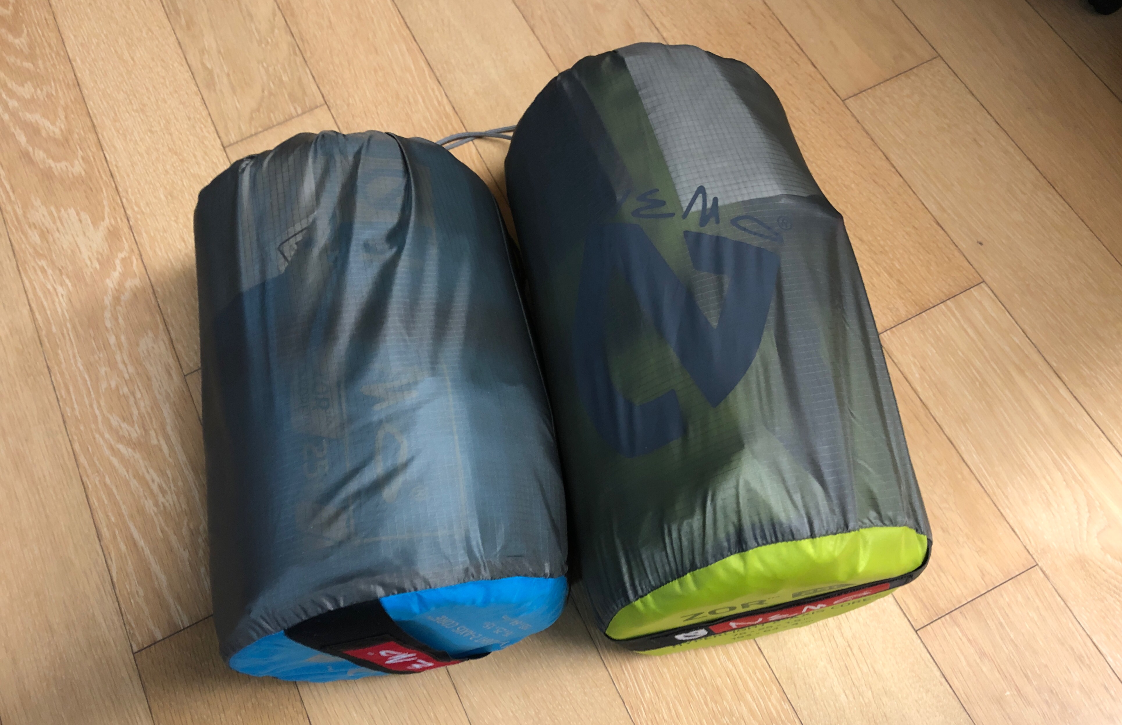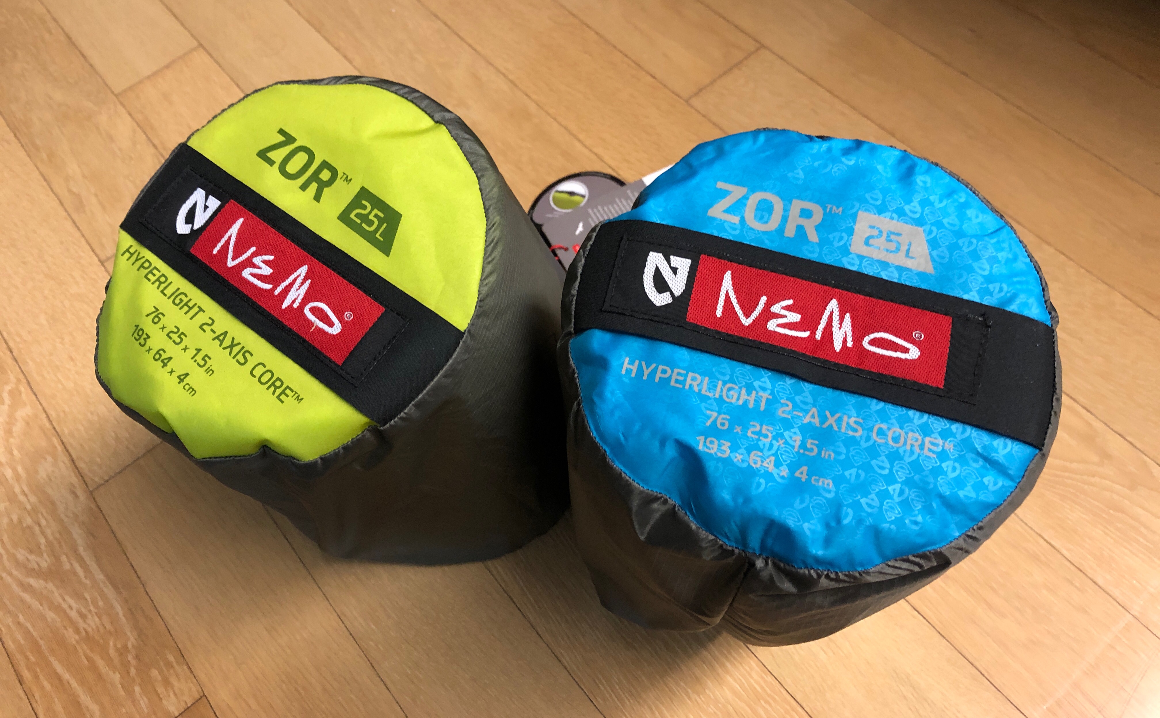 고른 제품은 NEMO ZOR 25L . 20R이 머미형으로 사이즈가 좀 더 작고 상대적으로 더 싼데, 그냥 2p 텐트안에 2개 넣어서 옆으로 빈공간 없이 깔기 위해서 사각형으로 선택하였다... 25L 이 20R보다 사이즈가 큰것은 둘째치고 두께도 더 두껍다는것도 장점