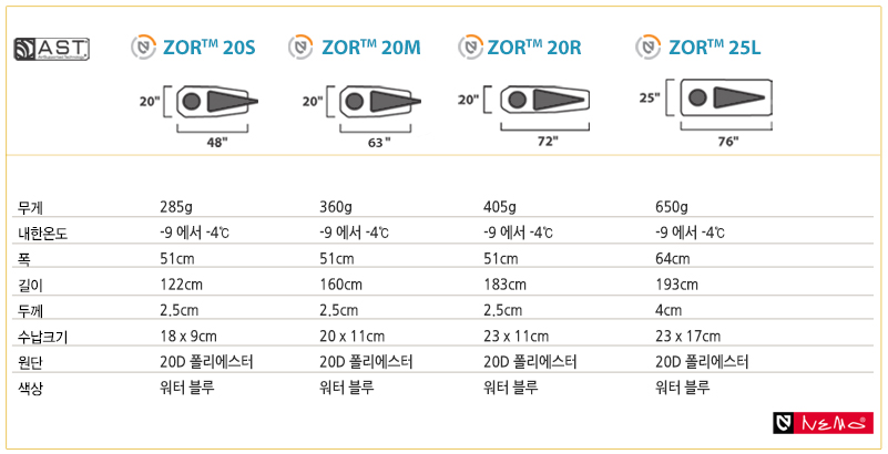 - 니모조르 25L : 내한온도 -9~-4, 20D 폴리에스터, 193*64*4, 22*15(수납), 650g