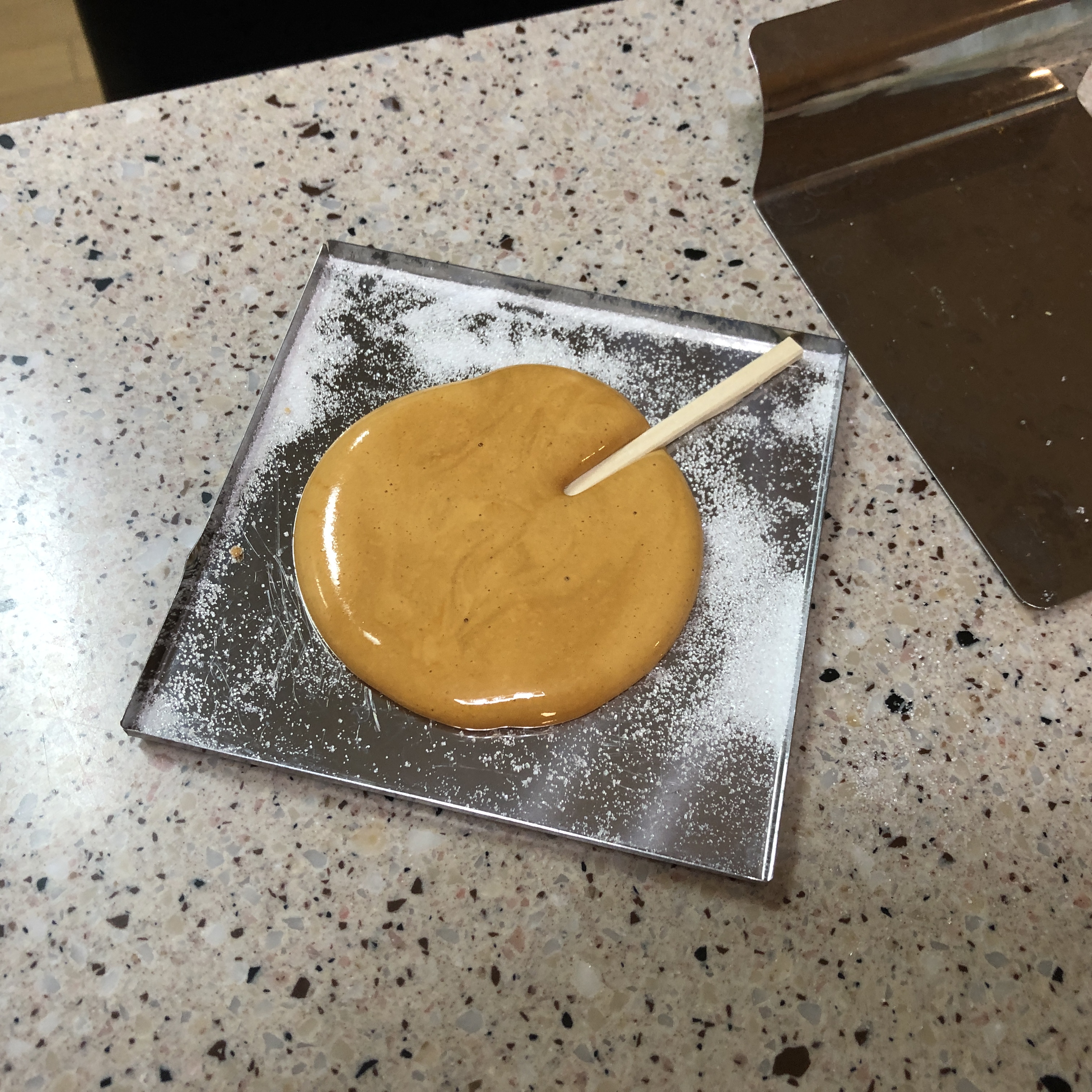 설탕을 미리 살짝 뭍힌 판대기에다가 부어야 잘 떨어진다.