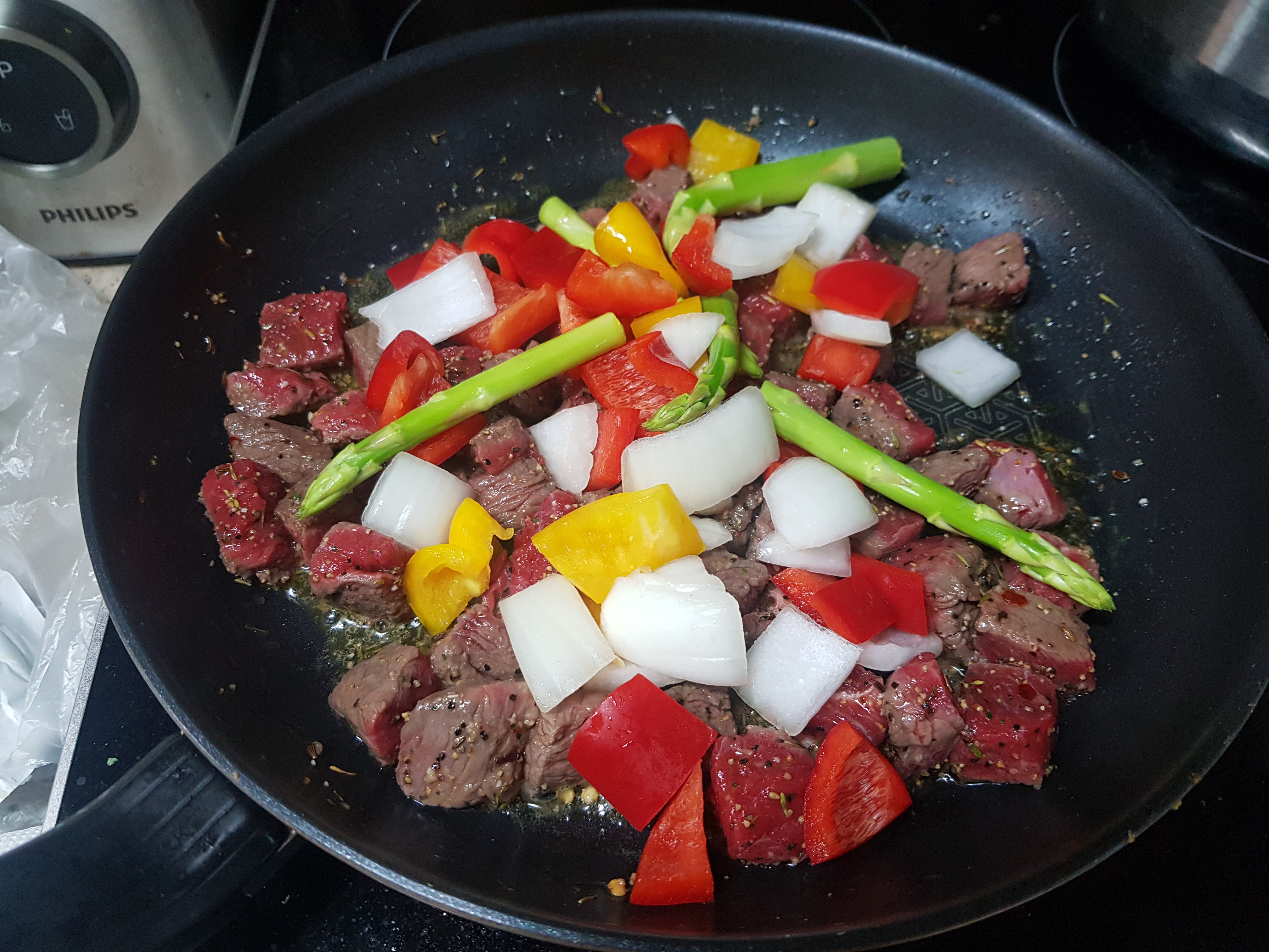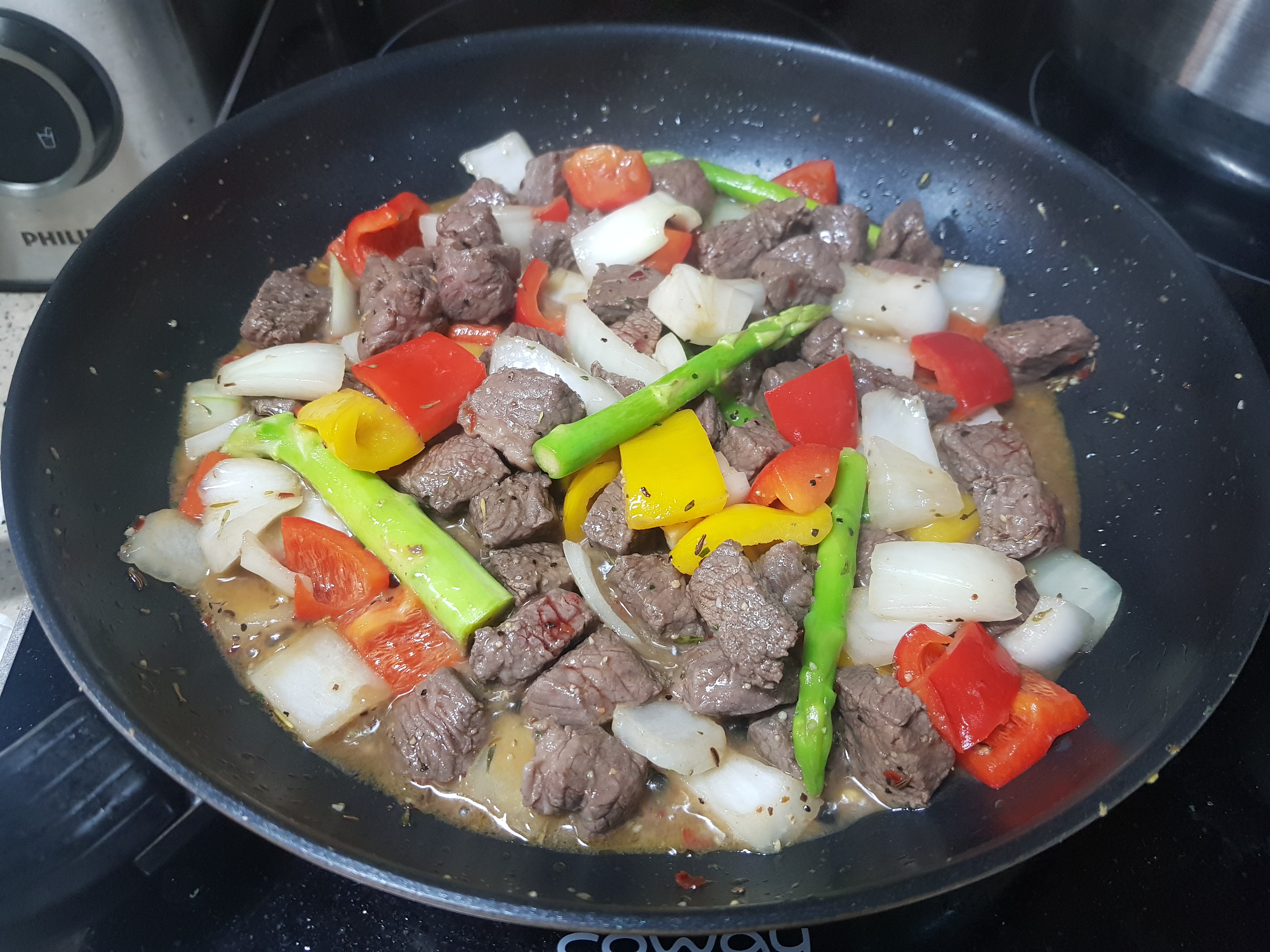 재료 : 소고기 부채살 300g, 올리브오일, 시즈닝, 버터, 양파, 파프리카, 아스파라거스, 마늘, 스테이크소스 (2~3인용)