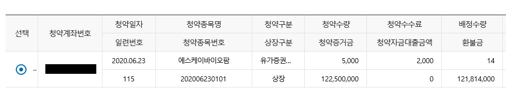 청약주수 5,000주로 하여 (공모가 49,000원) 2.45억으로, 50% 증거금으로 하여 1.2억가량 넣었는데,,,, 결과는