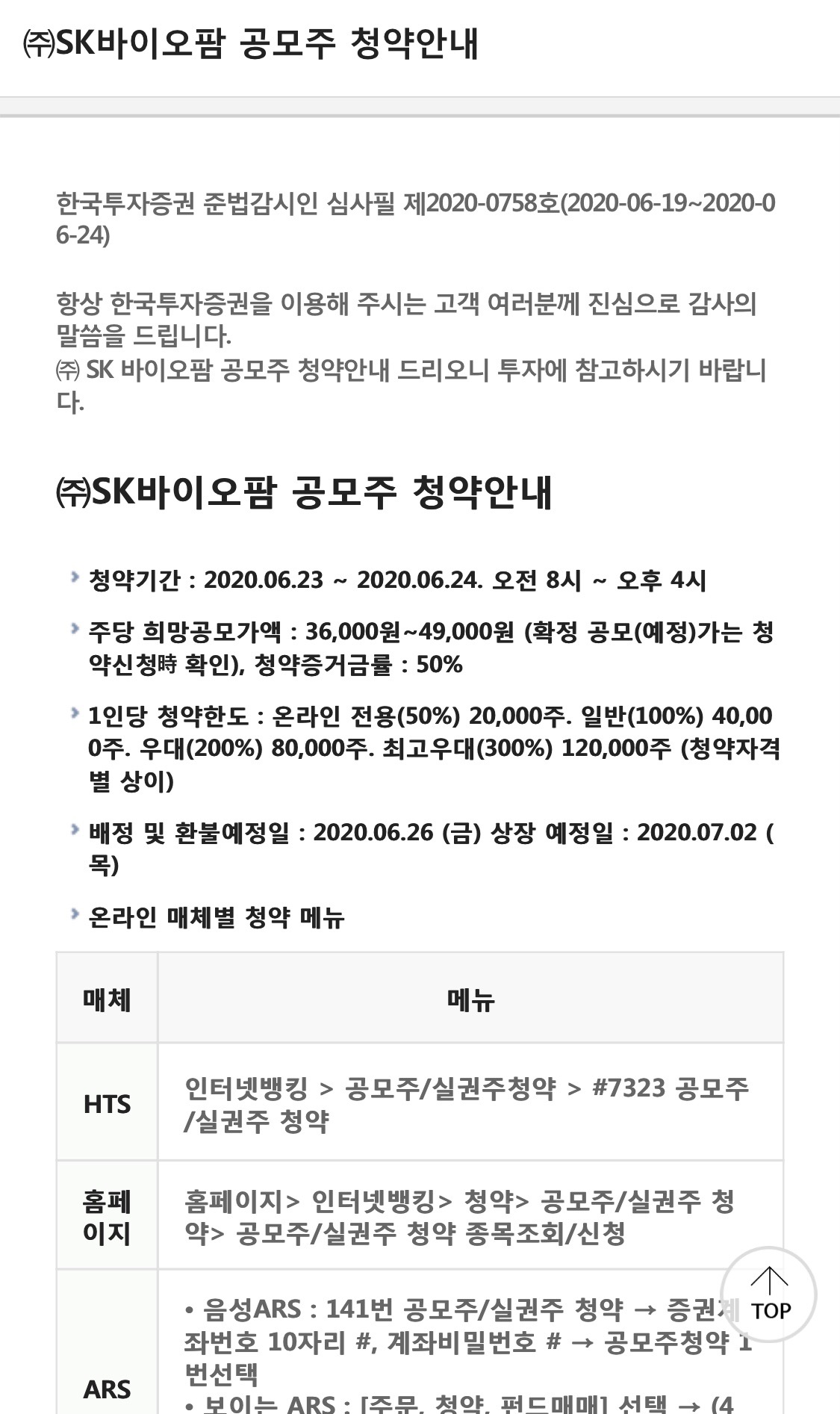 상장은 7월 2일이며, 청약은 6/23~24일 진행된다. 삼성바이오로직스 청약때 공모주 청약을 했던 관계로 SK바이오팜 역시 관심을 가질수 밖에 없는데, 일단 진행해 보기로...