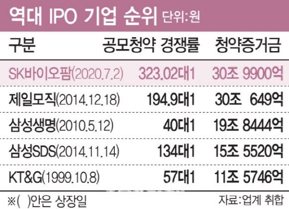 금융권에선 SK바이오팜 공모주 청약 금액이 지난 2014년 제일모직 기록을 깰 수 있는 게 아니냐는 관측도 나온다. 지난 2014년 제일모직 청약 경쟁률은 195대 1이었으며 30조원에 육박하는 청약증거금이 몰렸다.