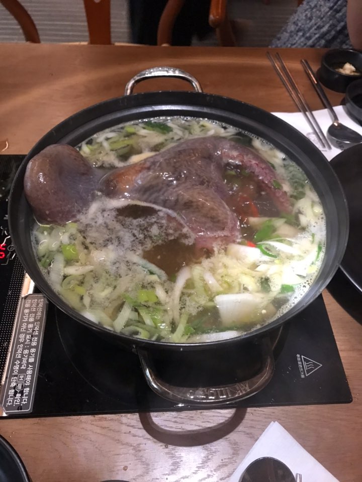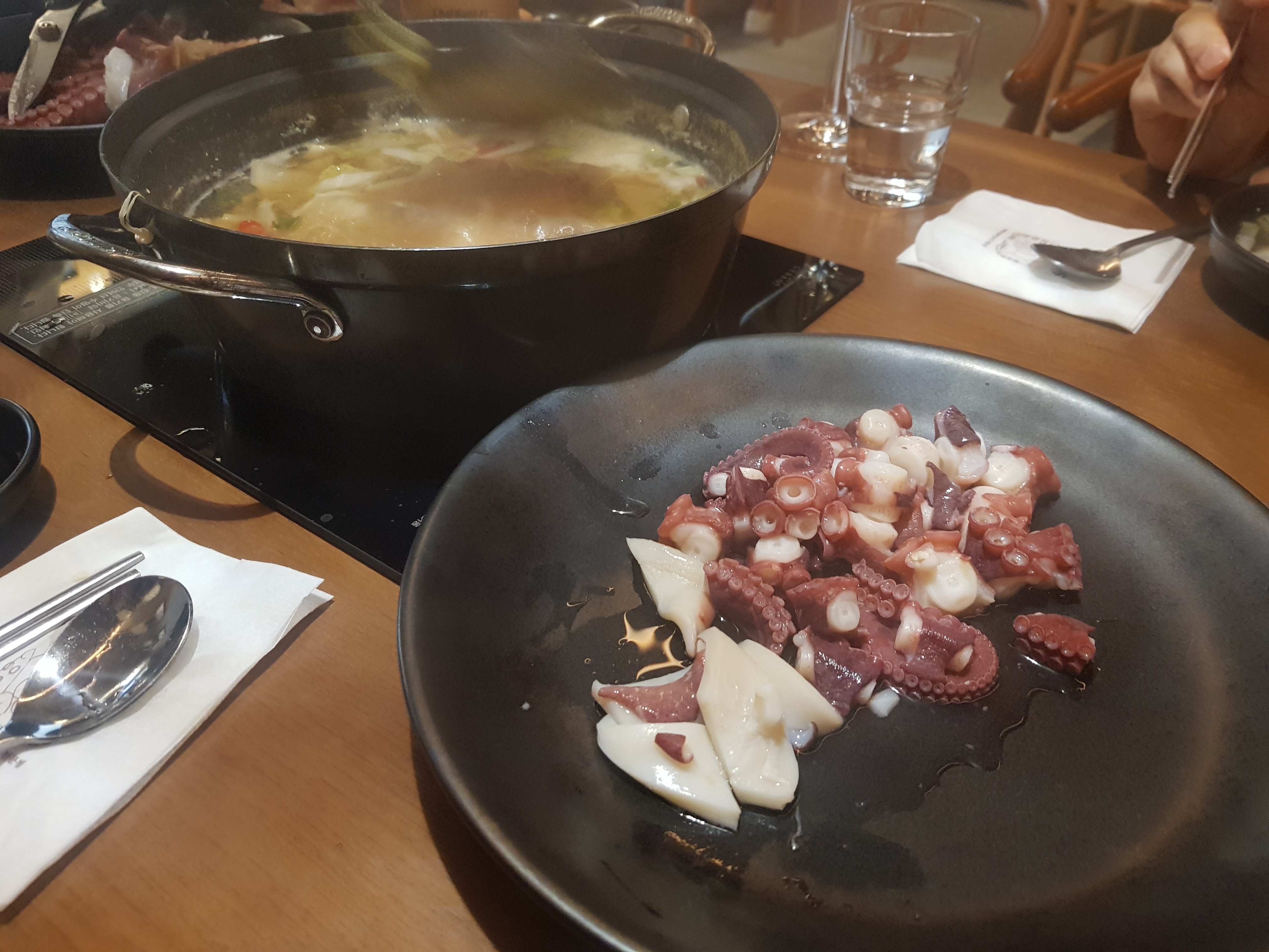 직원 1명이 붙어서 테이블에서 음식을 요리해준다. 완전 대접받는 느낌. 요래요래 생긴 문어 한 마리를 통째로 들고 와서 넣어준다.