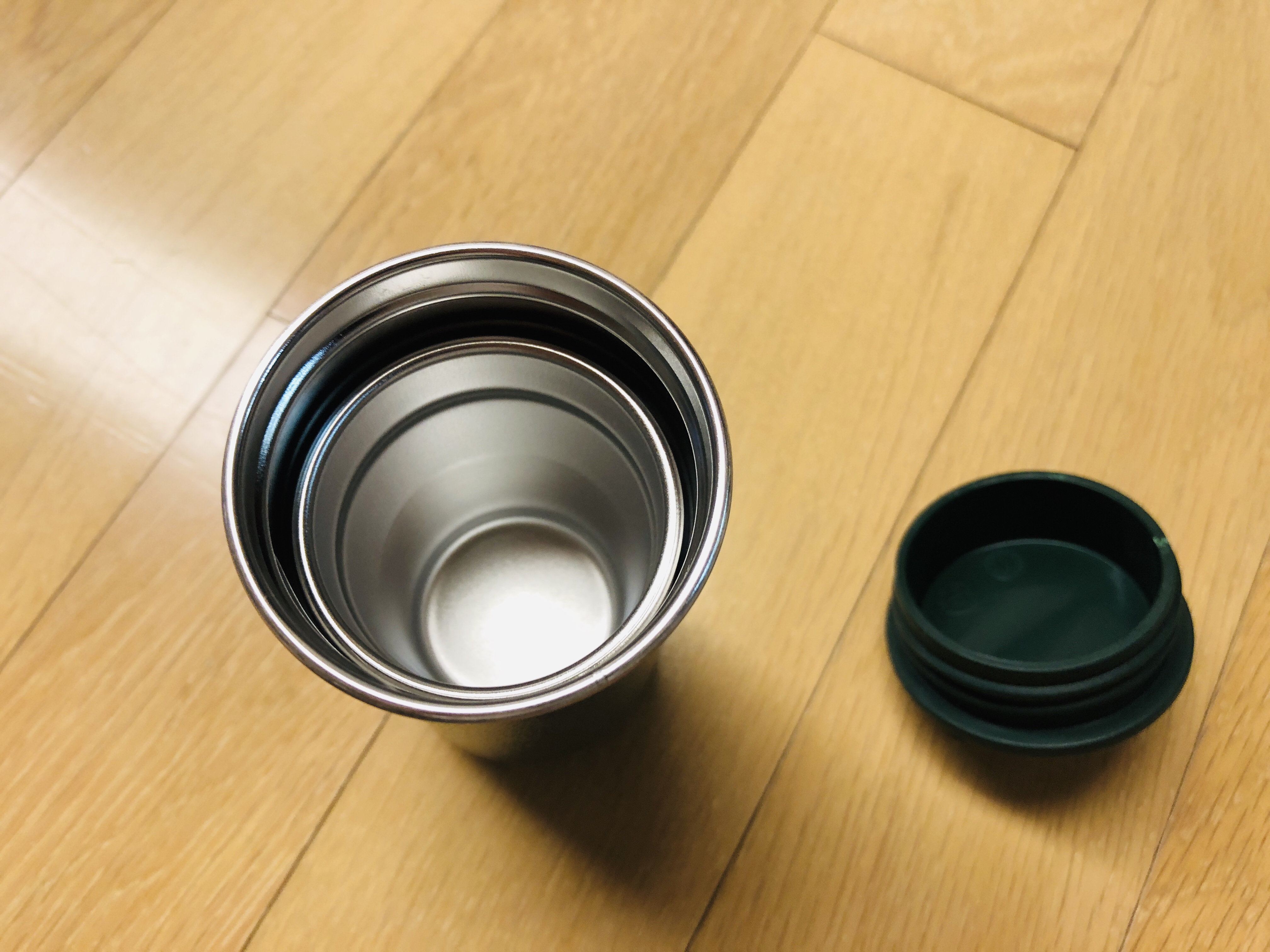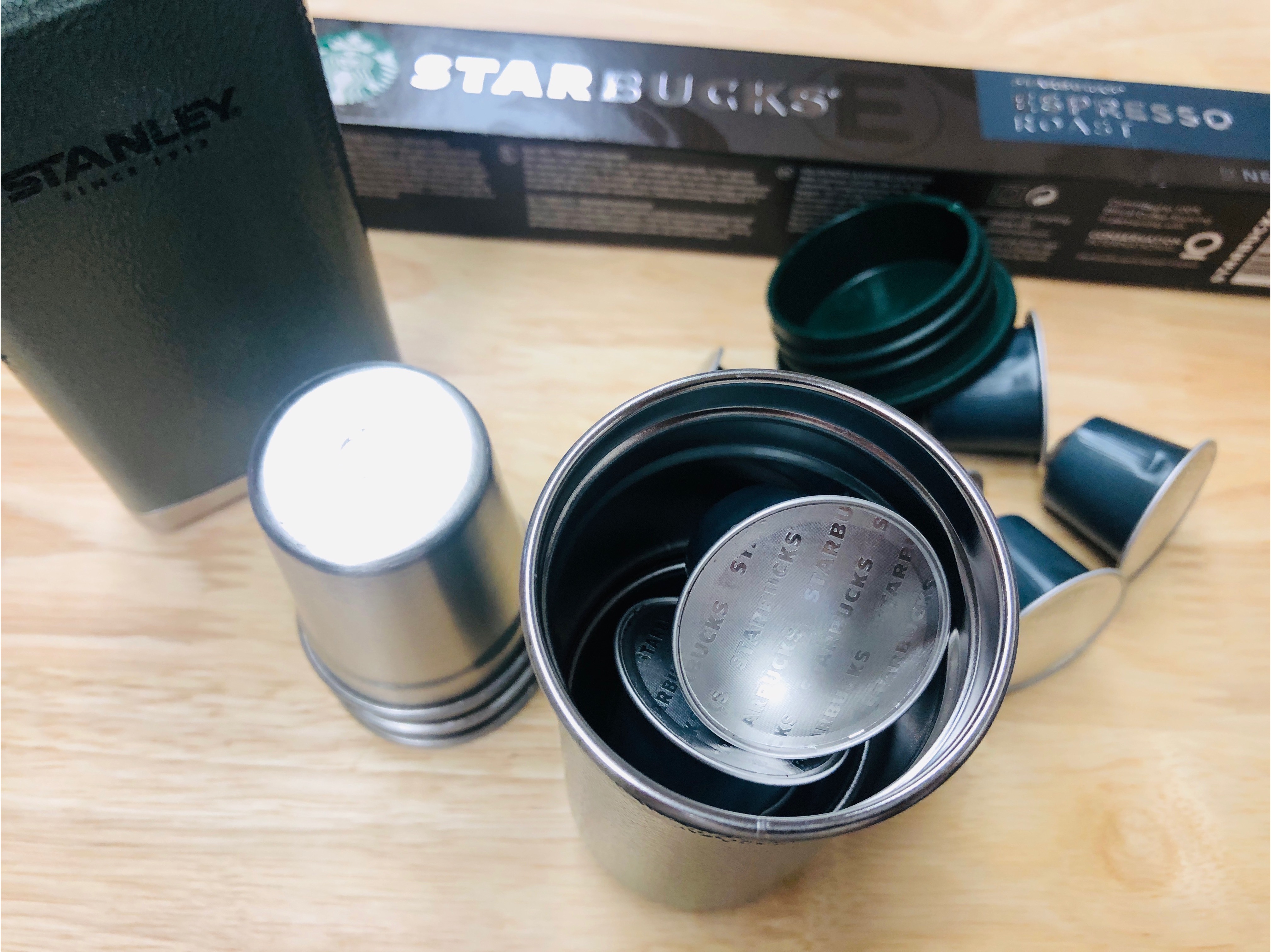 그리고 혼자 캠핑 갈때엔 스땡 컵을 하나만 넣고 갈 터, 공간활용을 위해 그 안을 뭘로 채울까 생각해보니 네스프레소 캡슐을 넣어봤더니 캡슐 4개가 딱 들어간다.