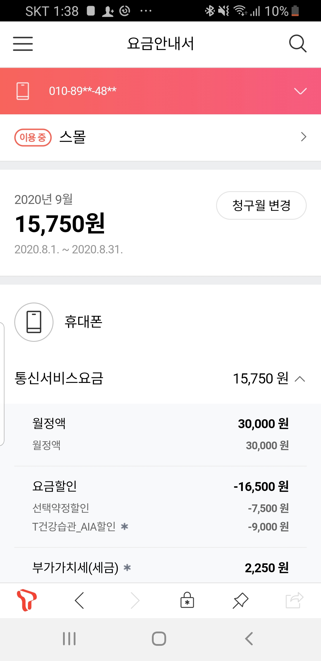 2020년 9월 청구 핸드폰 요금 역대 최저 기록. 15,750원.