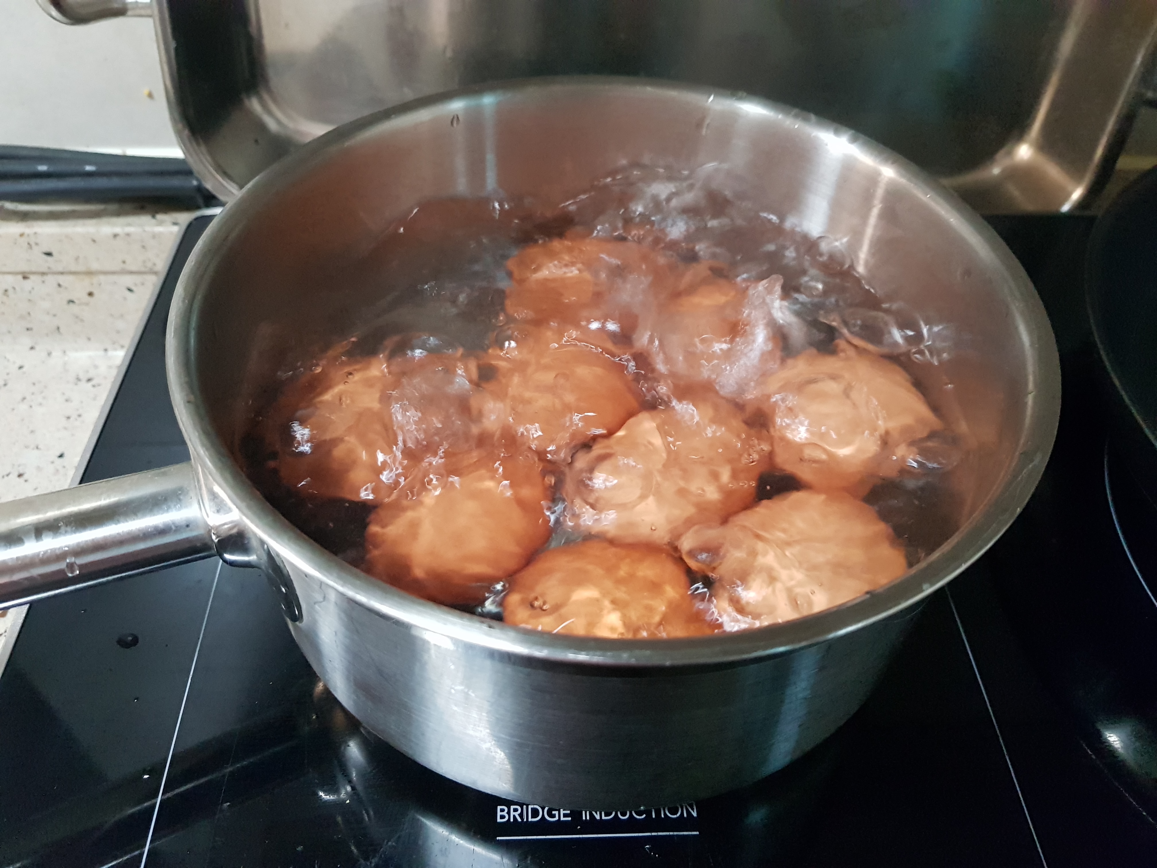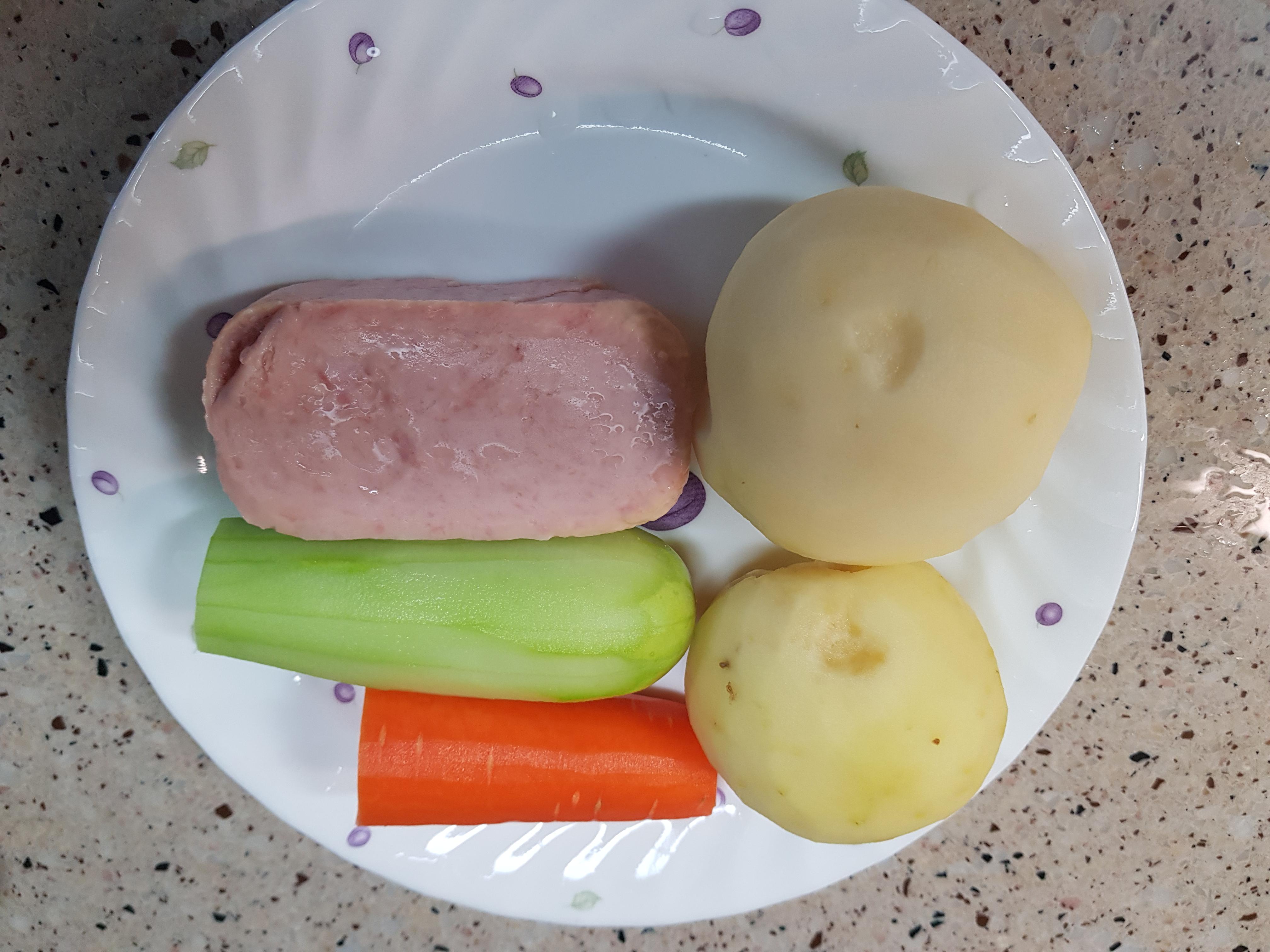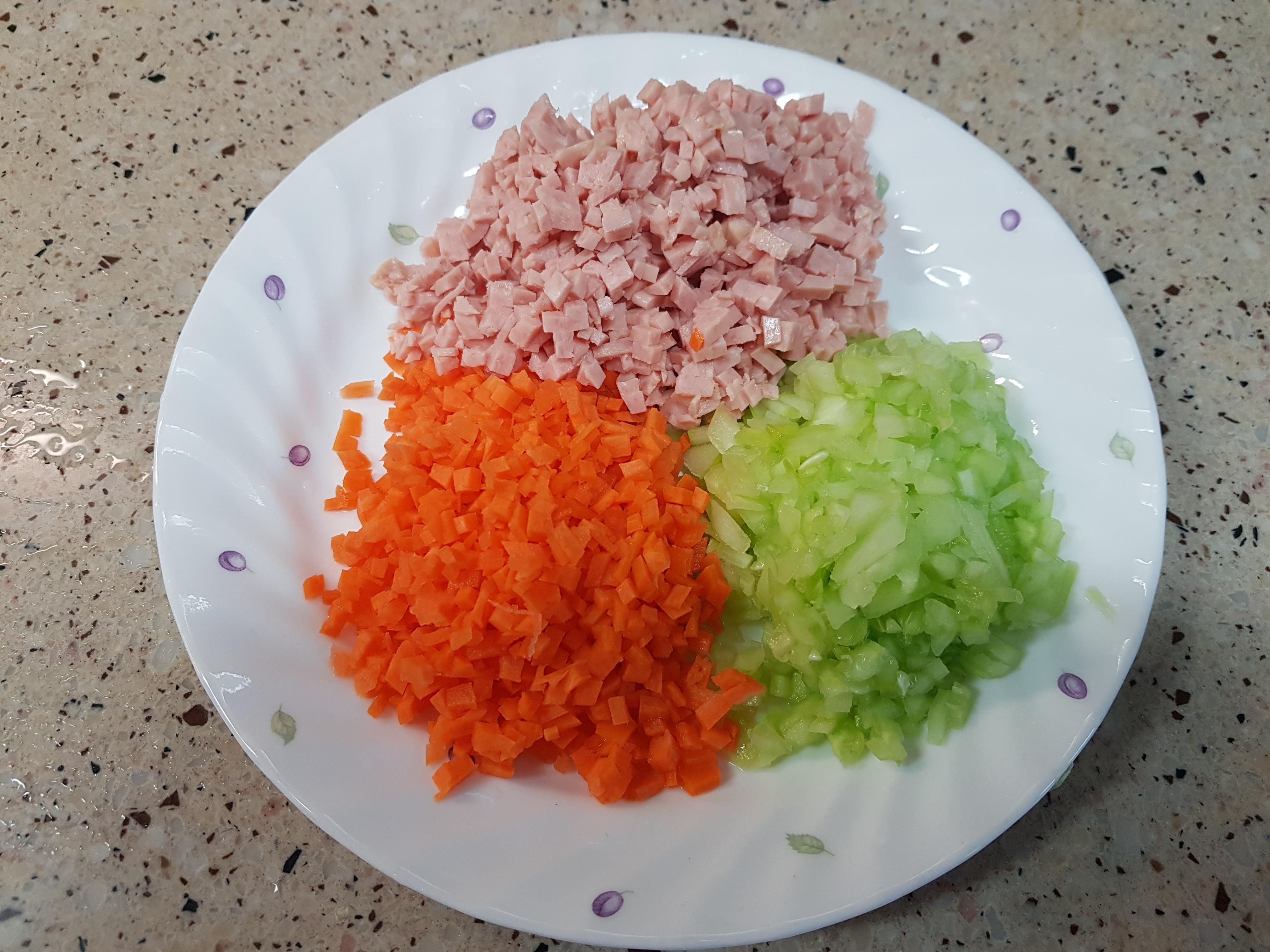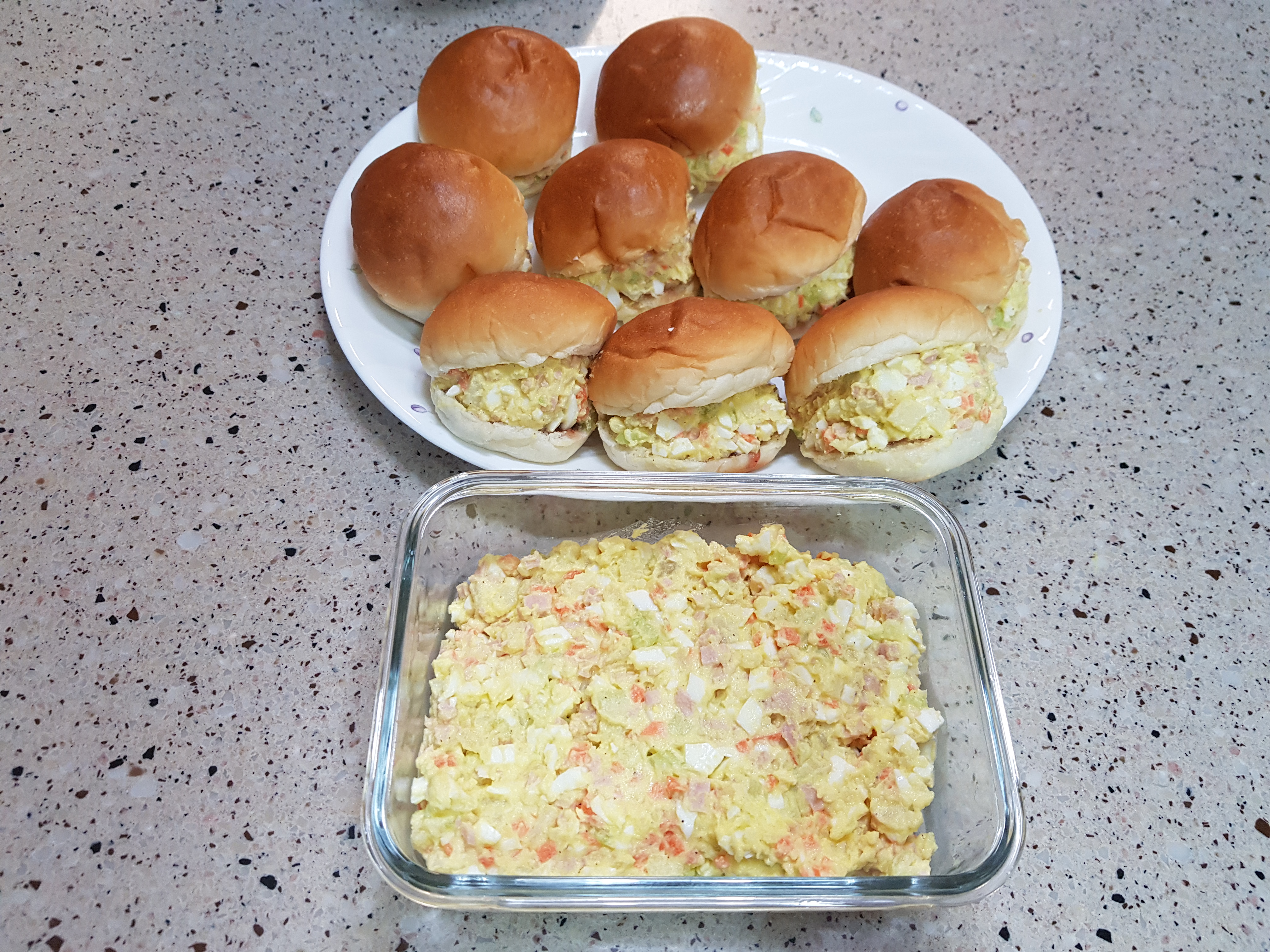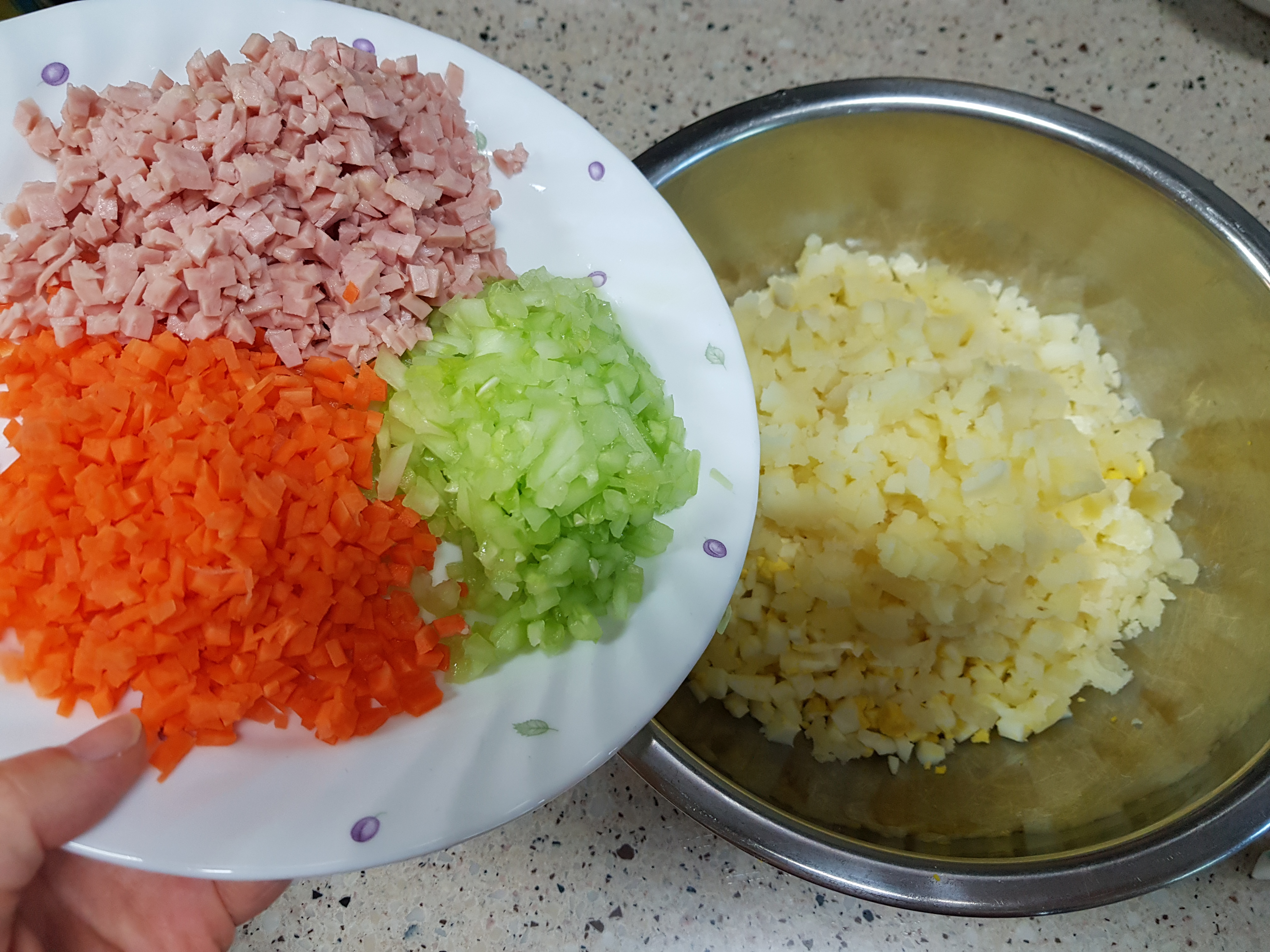 재료(식구 4명이서 두끼분에 해당함. 모닝빵 20개 만들수 있는 분량) : 계란6개, 감자2개, 오이반개, 당근반개, 햄, 마요네즈, 소금, 후추