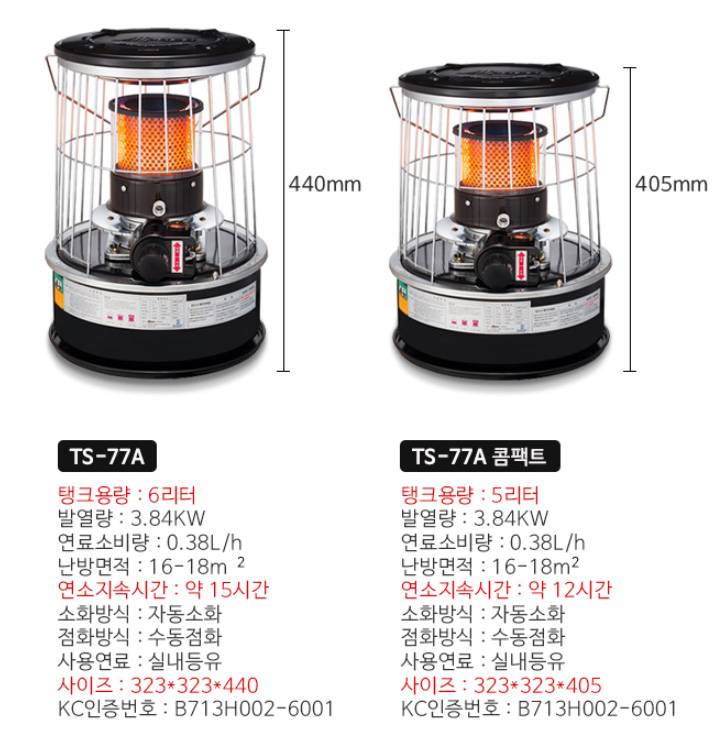 - 팬히터(등유) : 전기가 필수고 주 연료는 등유. 바람이 앞으로 나오는 관계로 난방효율이 높은반면 실내가 금방 건조해져서 가습에 대한 대책이 필수