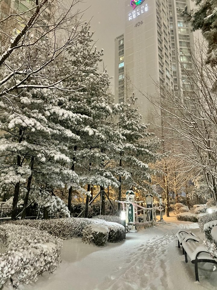 오후7시 30분경 퇴근하는데, 온 세상이 하애서 깜짝 놀랐다. 차도는 막히고 어수선했지만 아랑곳 하지 않고 나는 눈을 맞으며 천천히 걸었다.