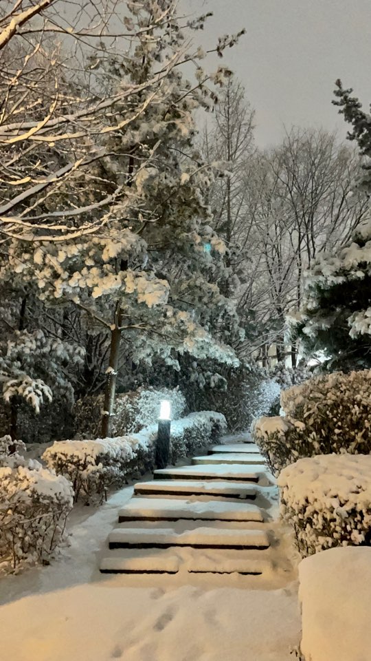밤하늘은 까맸으나, 사진 속 하늘과 내 마음은 온통 하얀색으로 가득찼다. 영화에 나오는 한 장면같다. 아이들 어렸을 때에는 이런 날 꼭 밖에 나와서 눈사람 만들고 눈썰매타고 했었는데, 그 아이들은 어디로 갔는고....ㅎㅎ 밖에 세워진 꼬맹이들이 만든 눈사람을 보며 잠시 추억에 잠겼다.