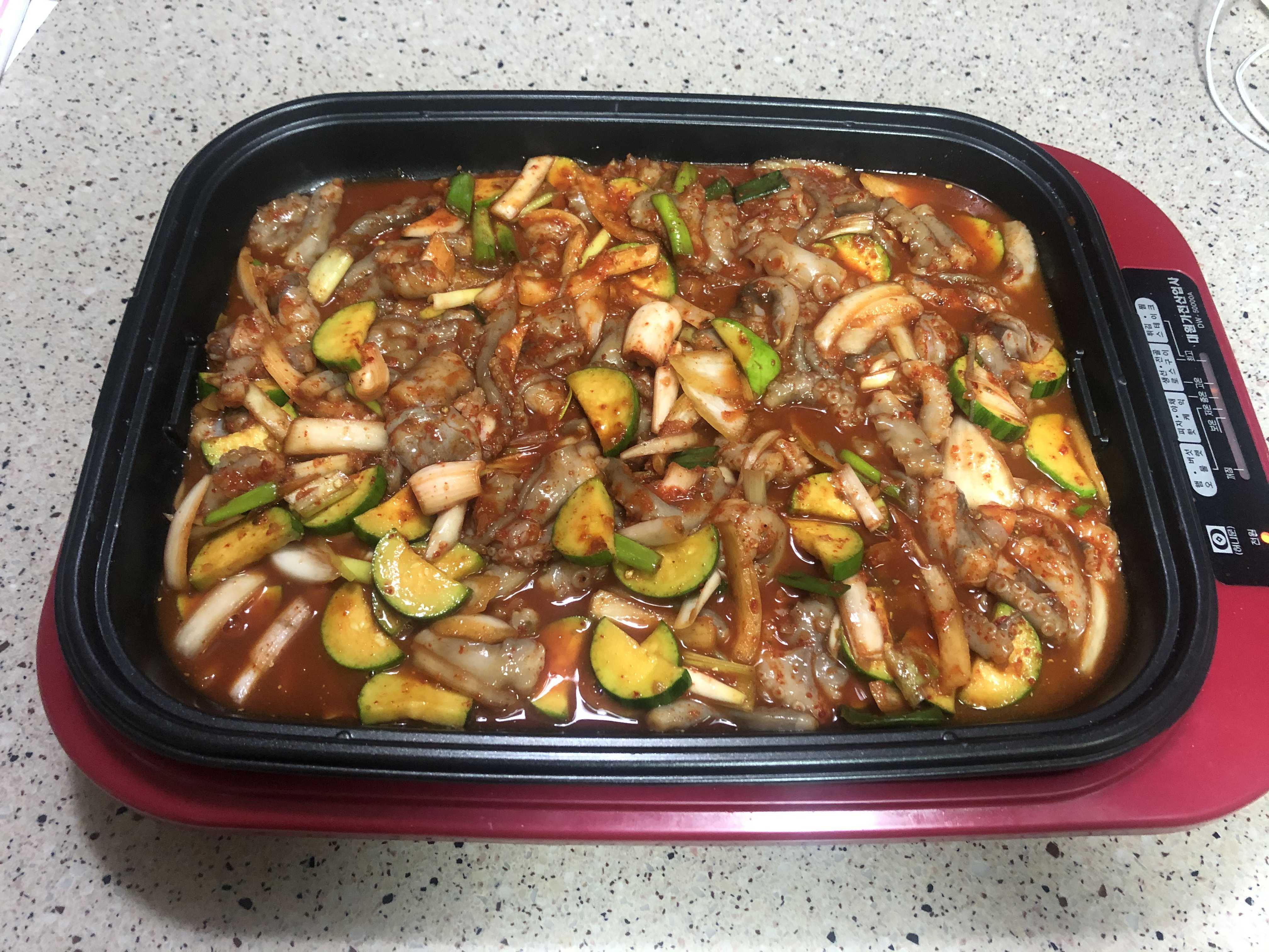 주말이면 가끔씩 엄마와 역삼역에서 만난다. 드라이브 쓰루로 엄마에게 각종 반찬 및 요리를 받아 다시 집으로 돌아온다. ㅎㅎ 코로나로 인해 집에 들어오기도 그렇고, 자식 힘들까봐 화곡동까지 오라고 하지도 못하시고,,,그래서 선택한 방법. 우리 엄마식 사랑표현이다. 연준이랑 연주가 낙지요리를 좋아하니 자주 해주신다. 양념까지 싹 다 해주신 요리를 요렇게 전기팬에 넣고 그냥 끓이기만 하면 끝. 내가 이래서 요리하기가 점점 싫어진다.ㅎㅎ