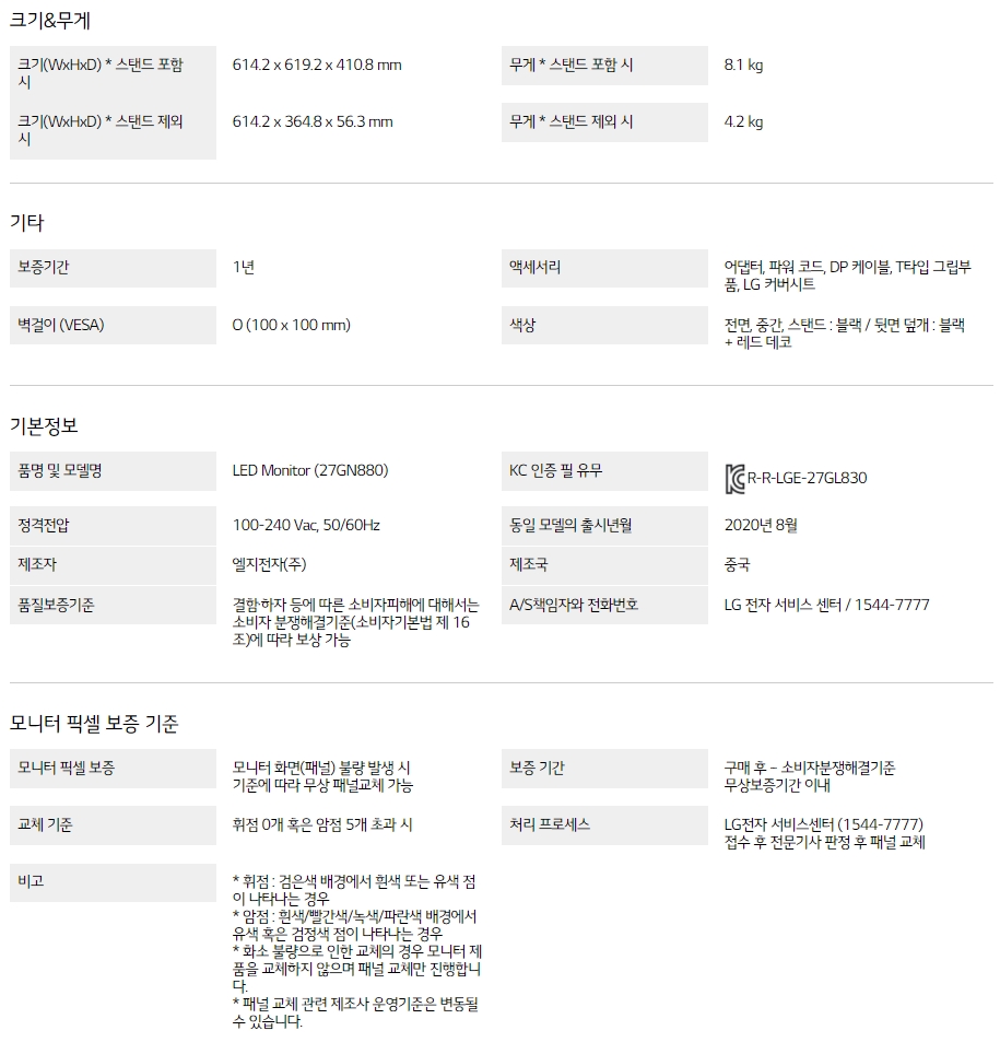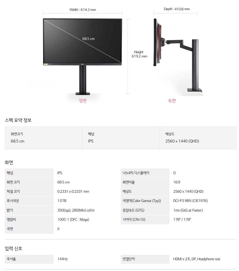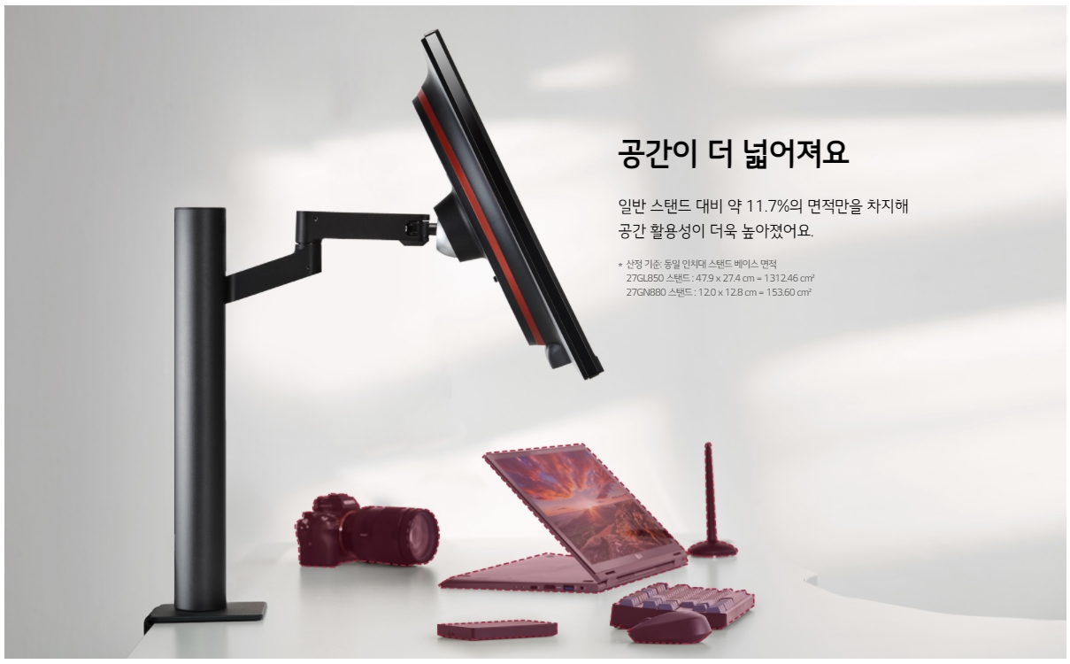 세모델로 압축되었다. 그 중에서 27GL850 정도가 딱 좋겠다 생각해서 알아봤으나 물건이 품절이라 그 모니터와 사양은 똑같으나 모니터스탠드가 아닌 모니터암 방식으로 나온 27GN880 으로 선택