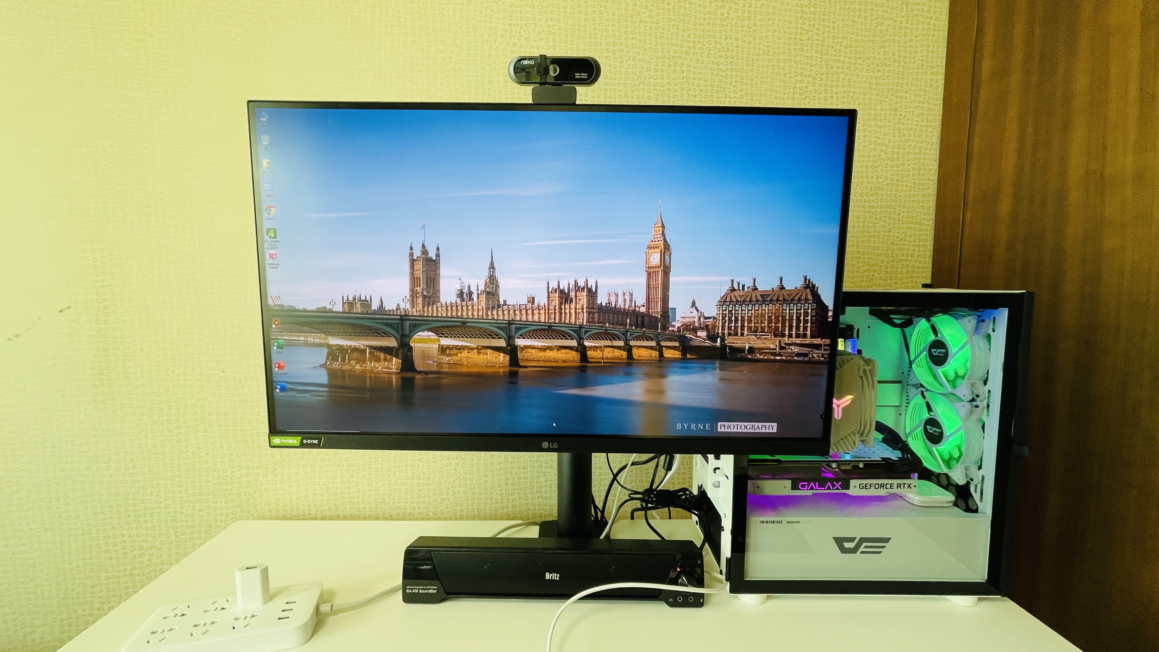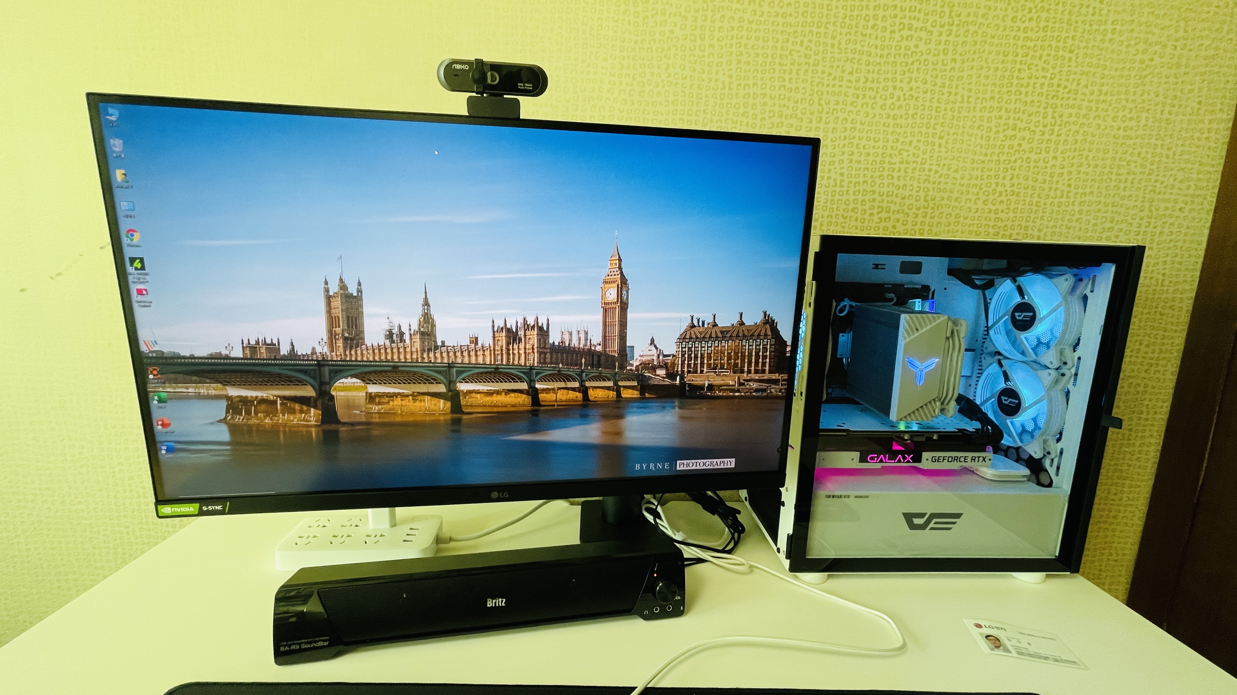 책상 전경. 모니터 암이 중간에 위치하고 모니터 위치는 자유자재로 움직일수 있다.