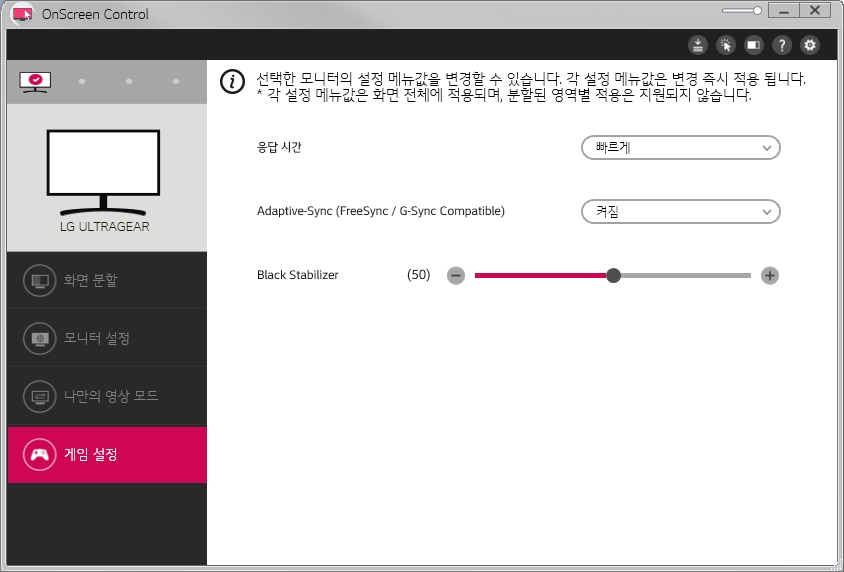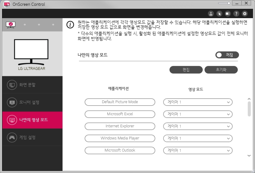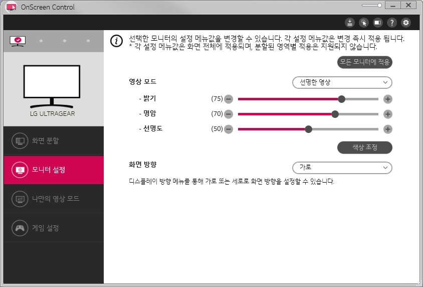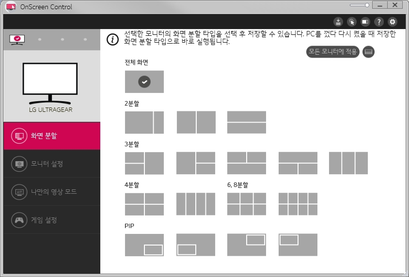 LG 모니터 소프트웨어를 설치하니 OnScreec Control 을 프로그램을 통해서 분할 설정, 간단한 설정등을 조정/저장할수 있게 되어 있다.
