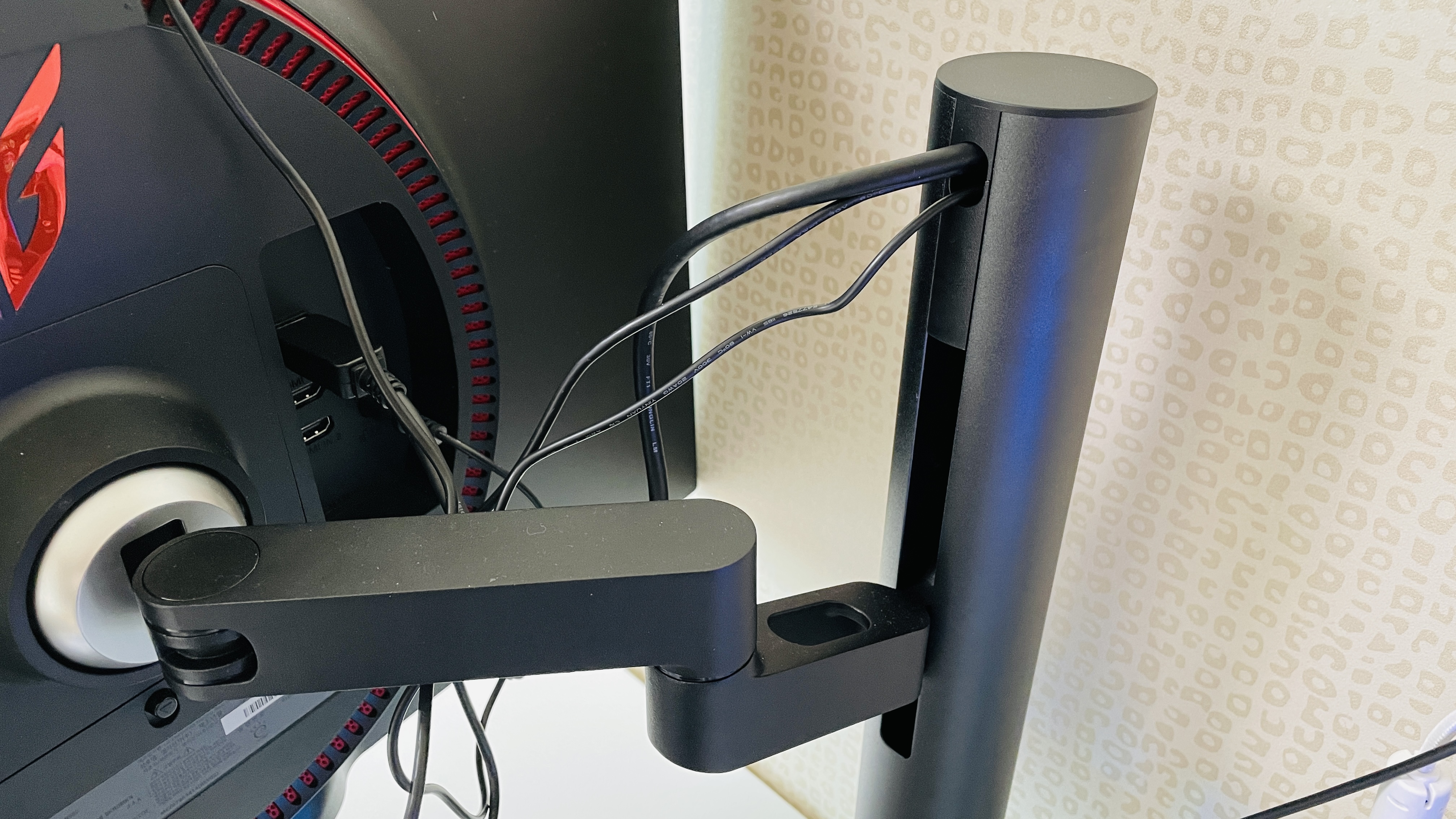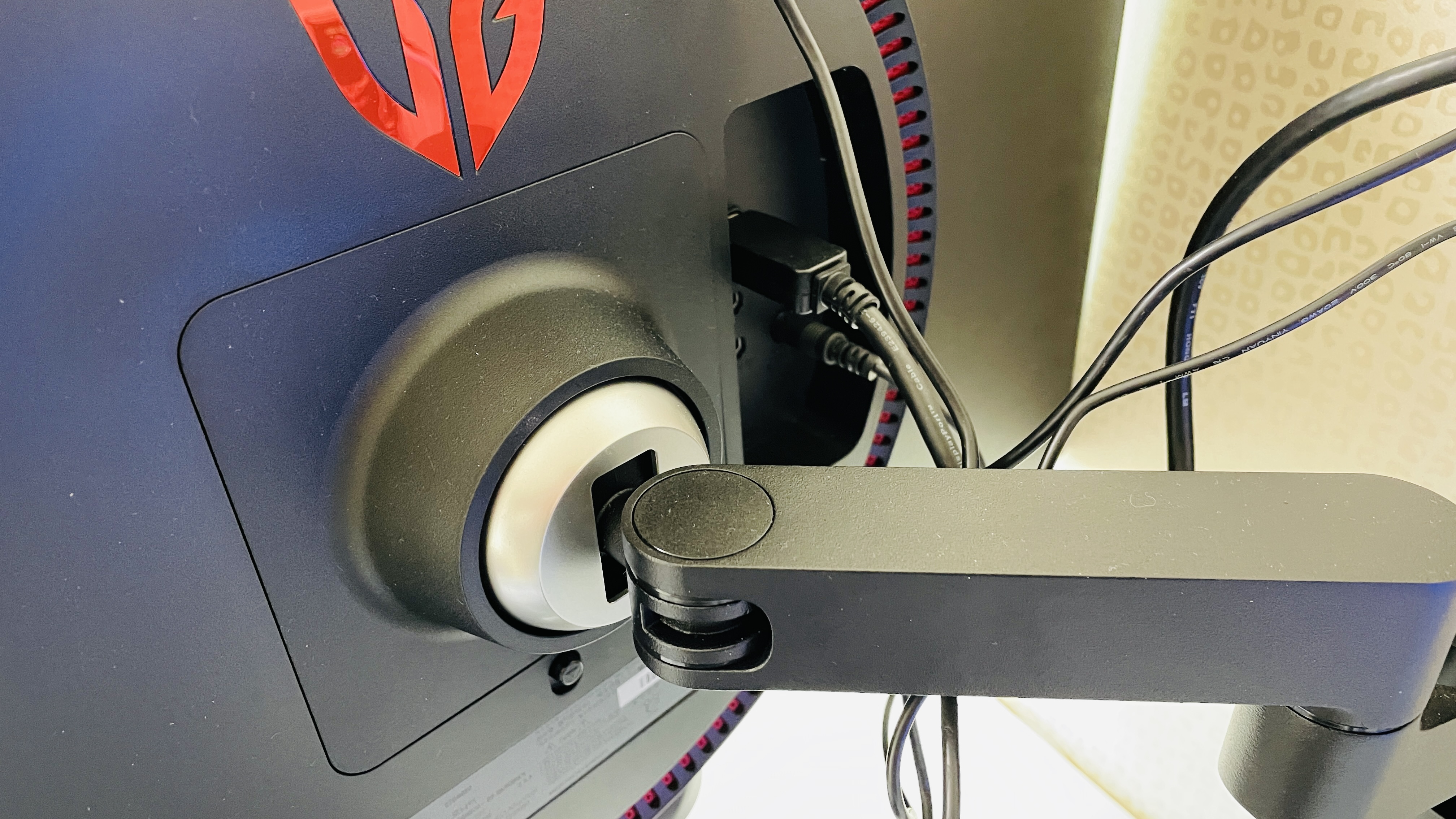 암에 모니터는 그냥 걸어주기만 하면 딸각 하고 장착이 되는데, 뺄때엔 사진에 보이는 조그만 버튼을 누른 상태로 들어올리면 그냥 뽑힌다.