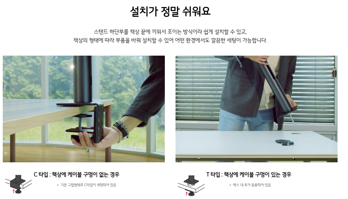 스탠드 방식이 아닌 모니터 암 방식인데, 구멍이 있을땐 그 구멍을 활용해도 되고, 그냥 책상 두께에 맞게 조절하여 장착하게 되어 있다.