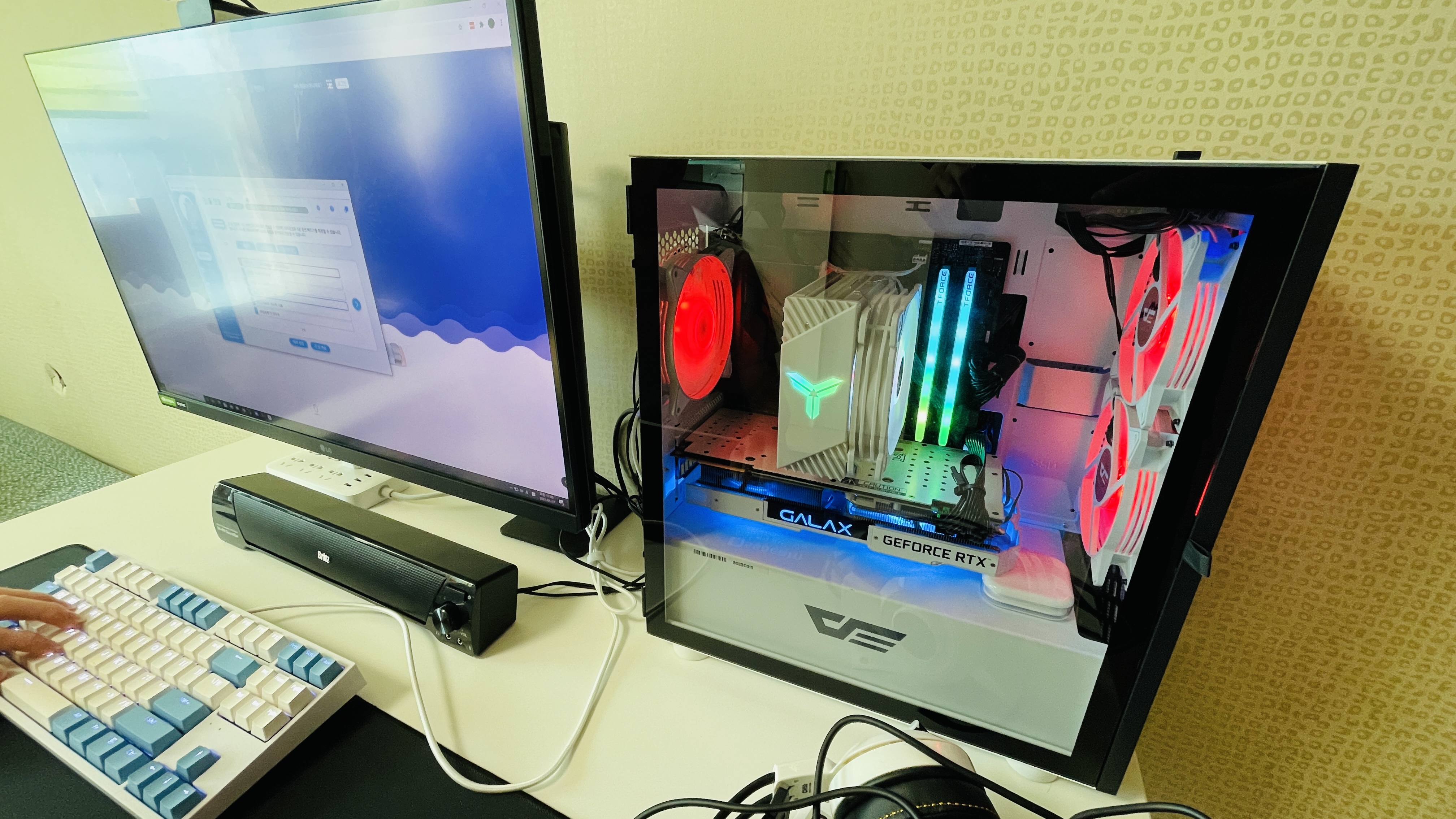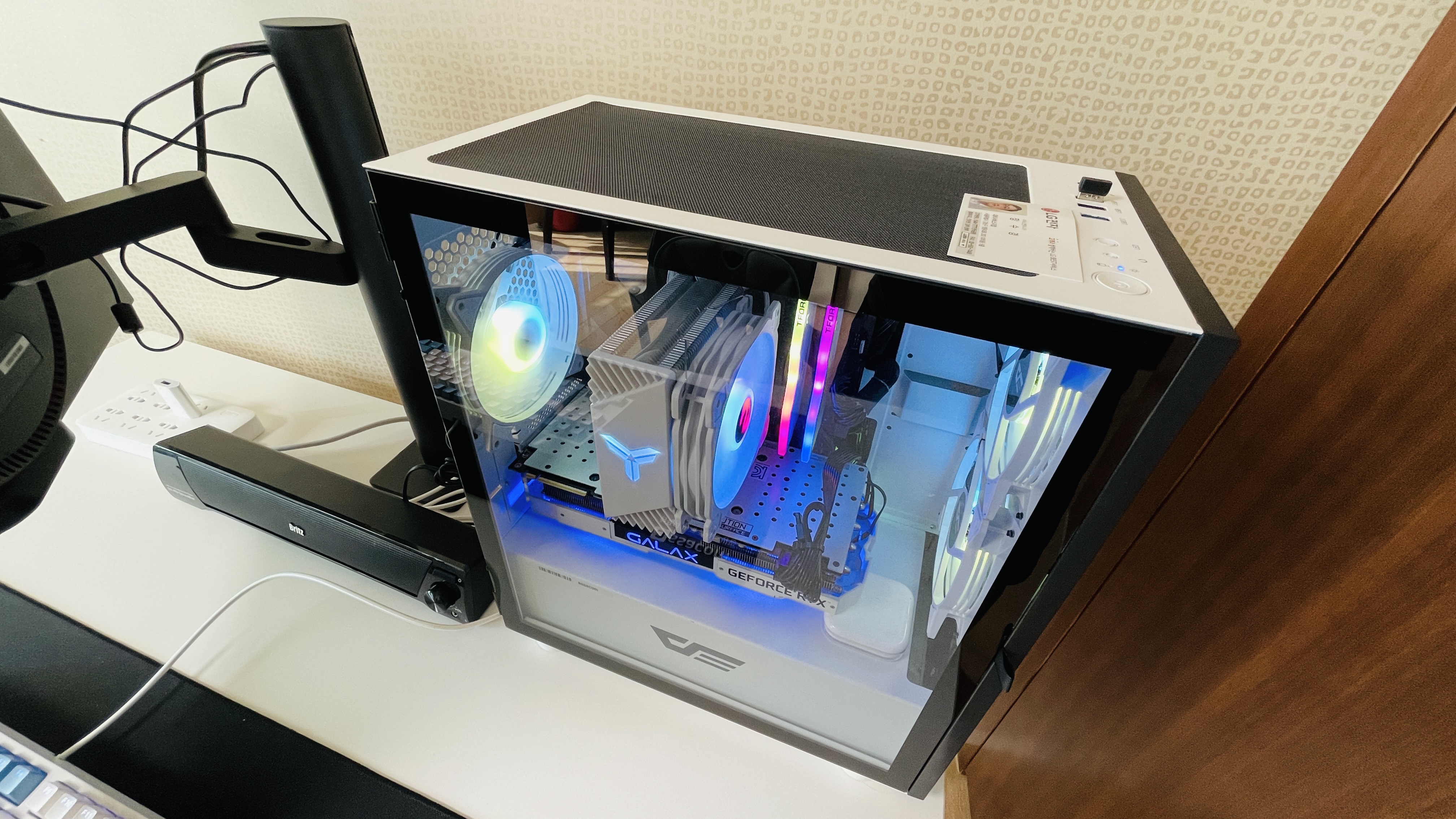 배송받은 본체. 받아서 전원 연결해보는 순간 화사한 조명이 연출되어, 옛날 투박하던 데스크탑 컴퓨터의 모습과는 다르게 장식품과 같은 느낌이 난다.