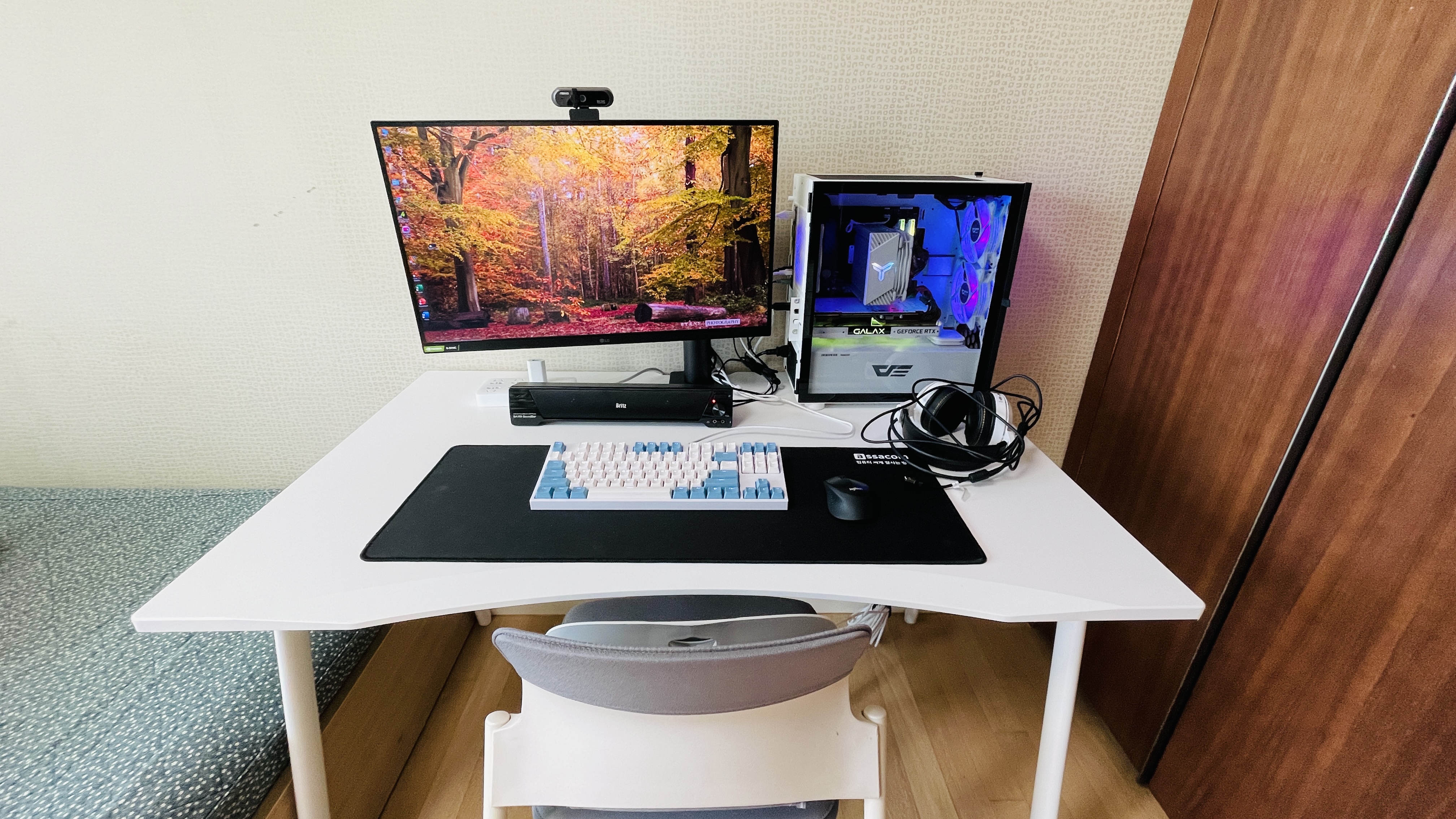 컴퓨터 책상은 어반휴 커브드 게이밍책상 1인용 컴퓨터책상으로, 모니터 암 장착하기 좋게 뒤쪽에 약간의 홈이 파여져 있고, 앞부분역시 커브형태로 홈이 파여져 있어 구입한 제품.