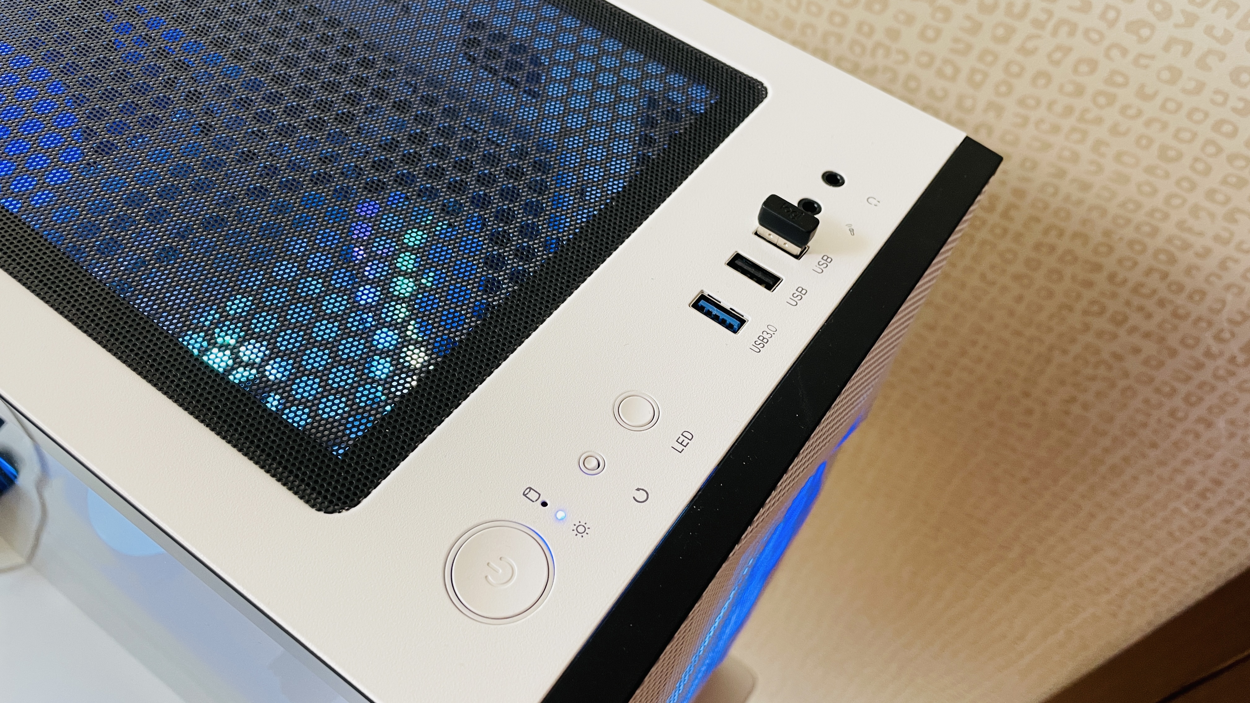 전원버튼, 상태표시등, 리셋, 내부 LED조명색상선택 버튼, 기타 USB 단자와 헤드셋/마이크 구멍이 있다.