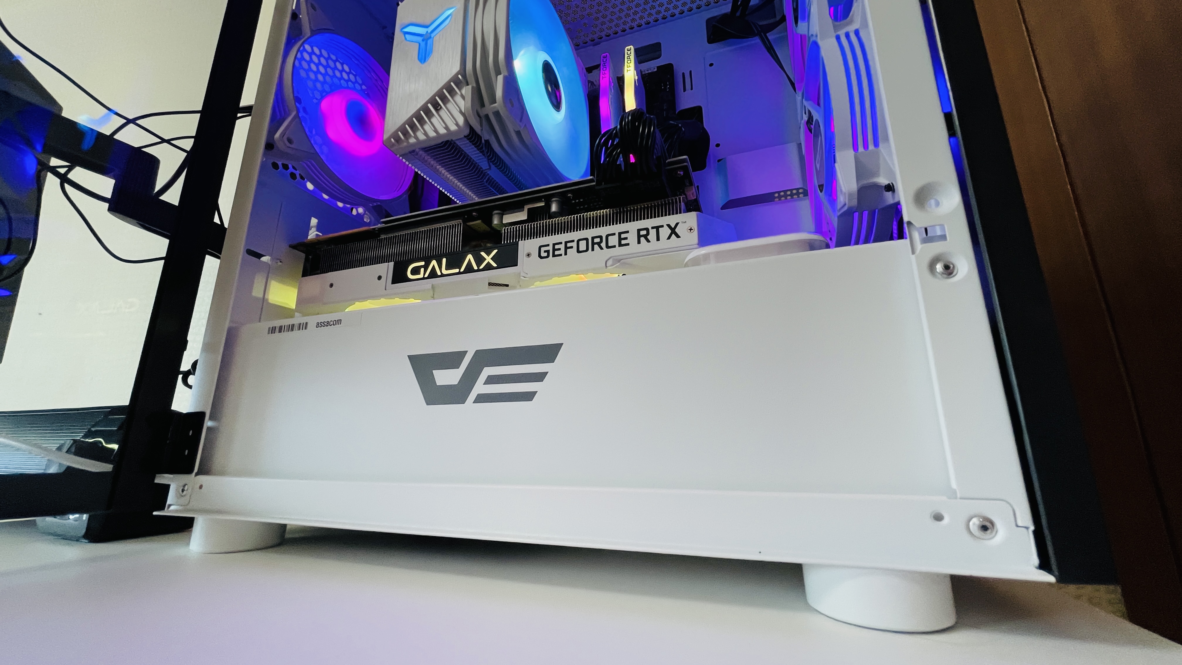 파워는 케이스 하단에 가림막으로 가려져 있어, 과거에 본인이 한참 조립하던 시절의 조립컴퓨터와는 다르게 아주 깔끔하다. 다만 그래픽카드가 너무 두꺼워서 끝 부분이 좀 쳐지는 경향이 있어 이어팟 케이스로 지지를 해두었다.