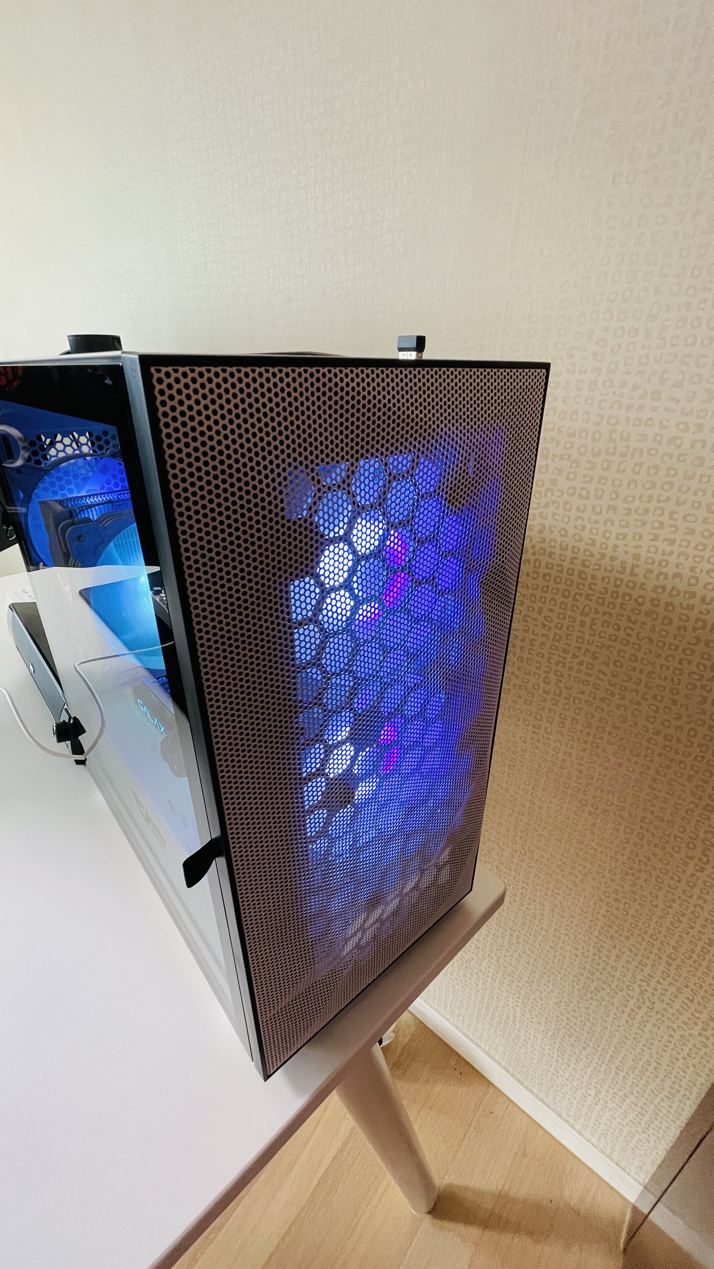 배송받은 본체. 받아서 전원 연결해보는 순간 화사한 조명이 연출되어, 옛날 투박하던 데스크탑 컴퓨터의 모습과는 다르게 장식품과 같은 느낌이 난다.