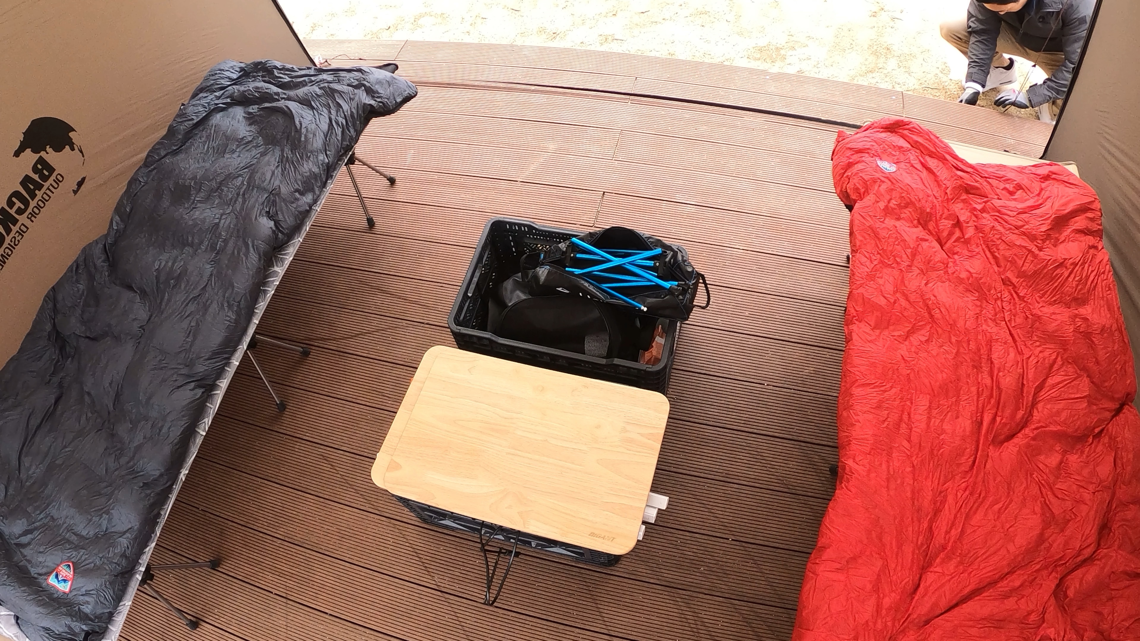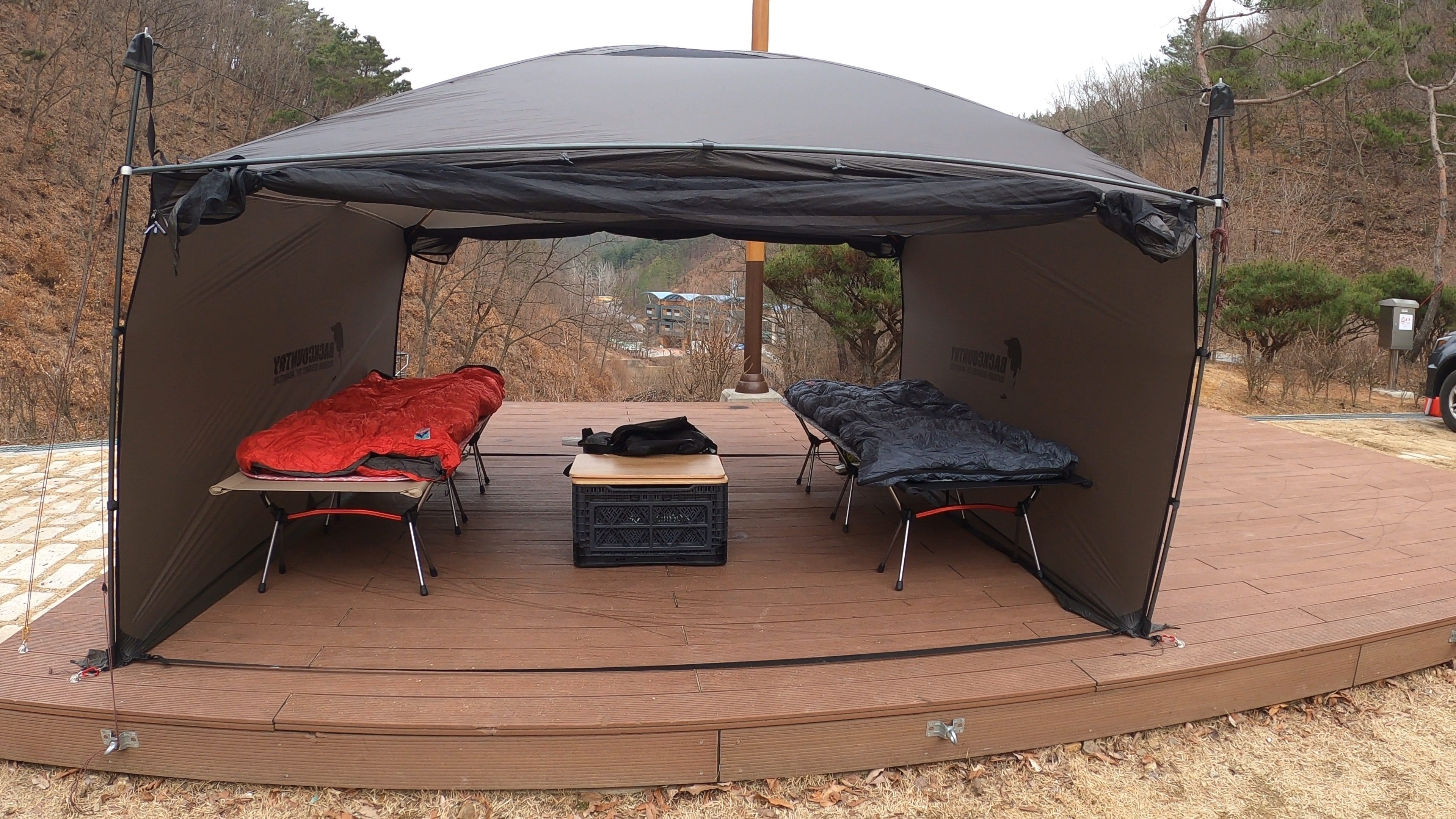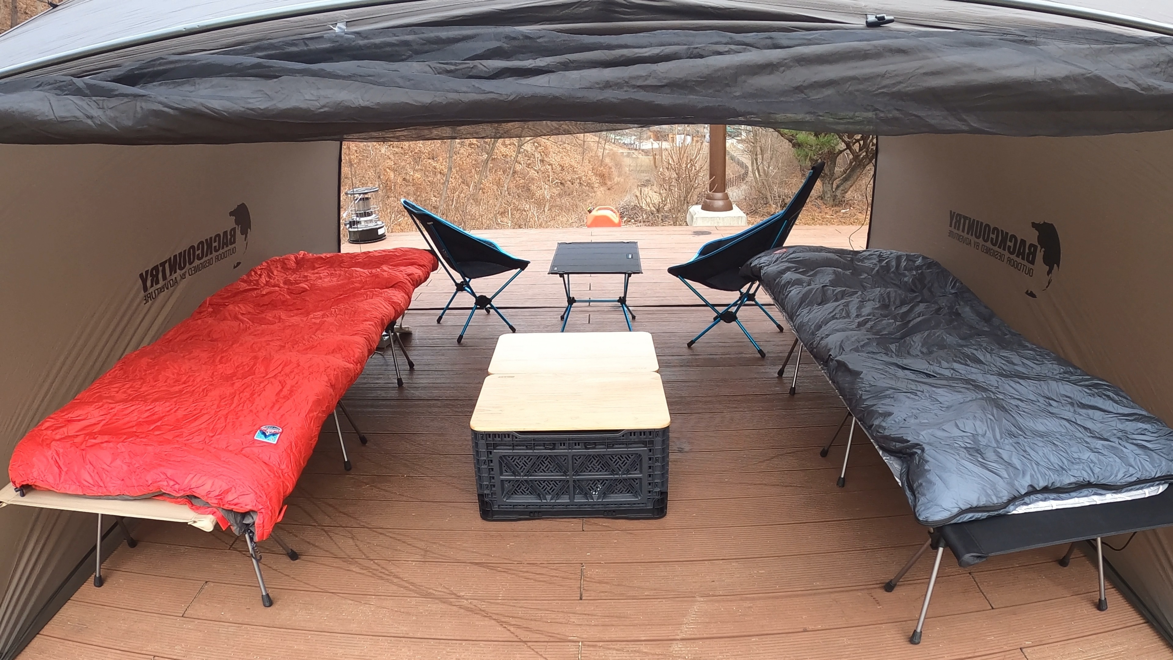 A4 데크에 설치한 백컨트리 280 쉘터. 데크가 커서 공간이 남아돌았다. 넓이가 35제곱미터로 나오는걸로 보아 7M * 5M 정도로 보인다.
