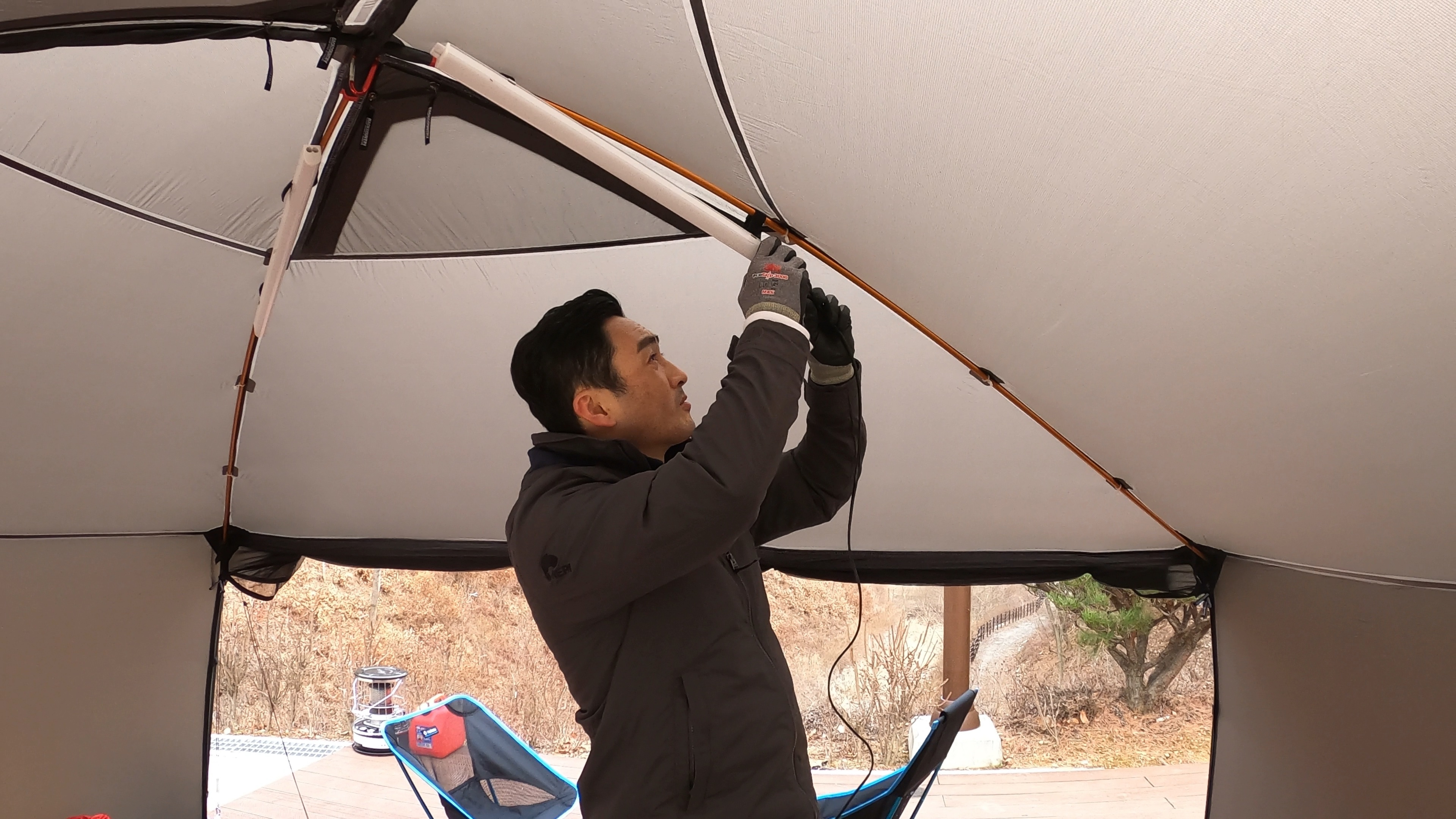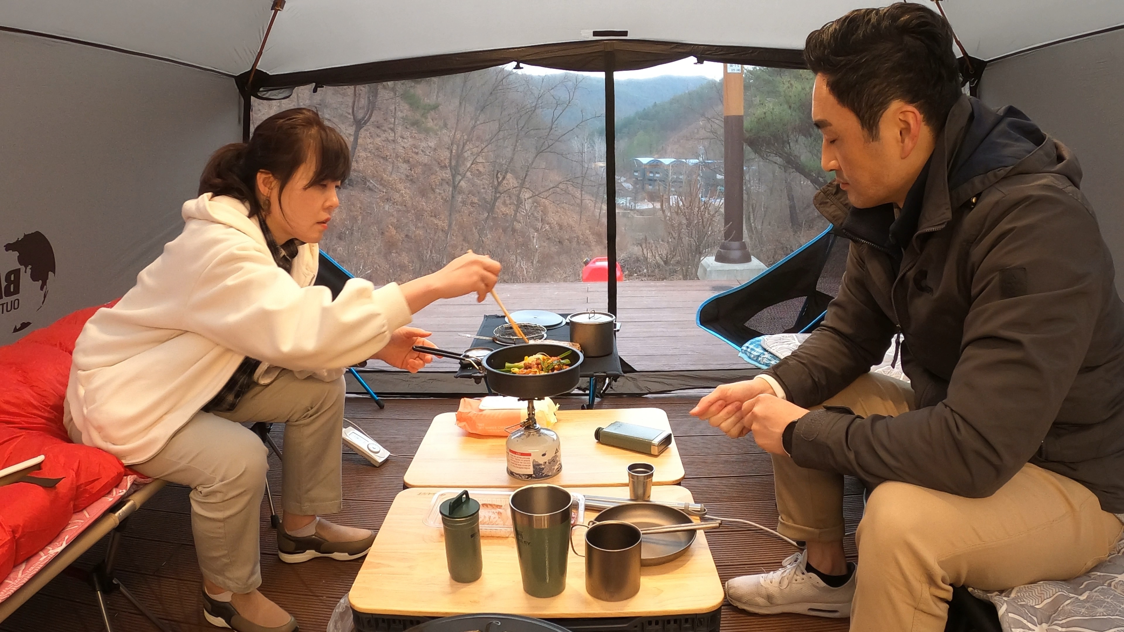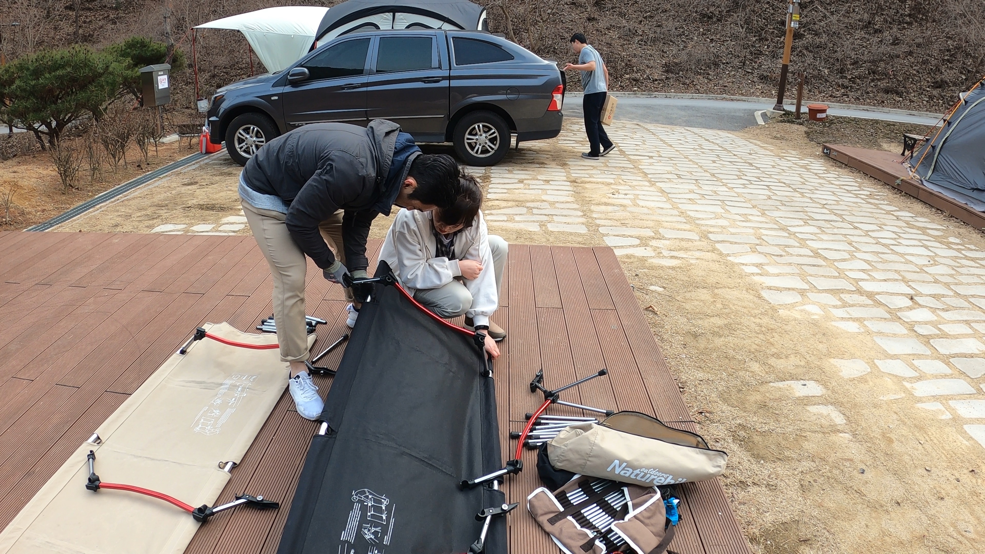 부부동반으로 간 캠핑에서는 항상 나는 텐트를 치고, 와이프는 체어와 야전침대 조립을 맡는다.