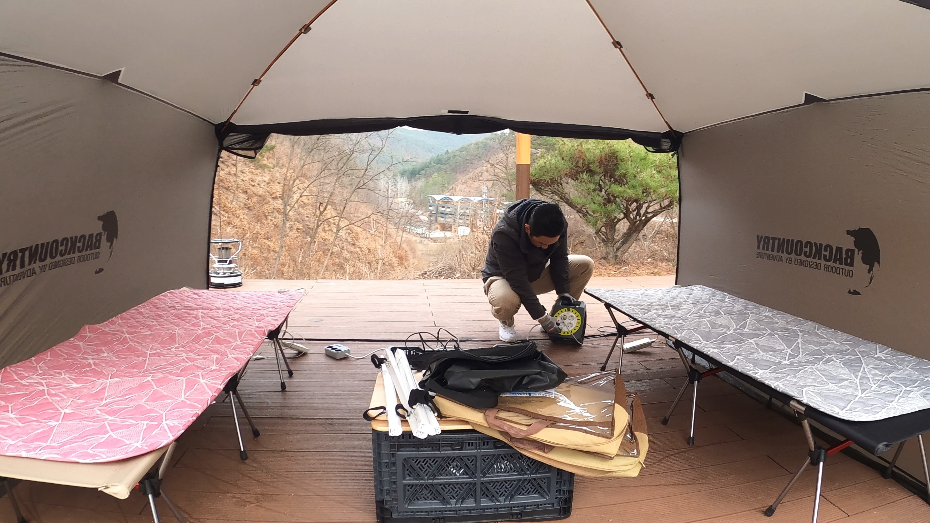 야전침대 두개 위에는 140W 전기요를 덮었다.