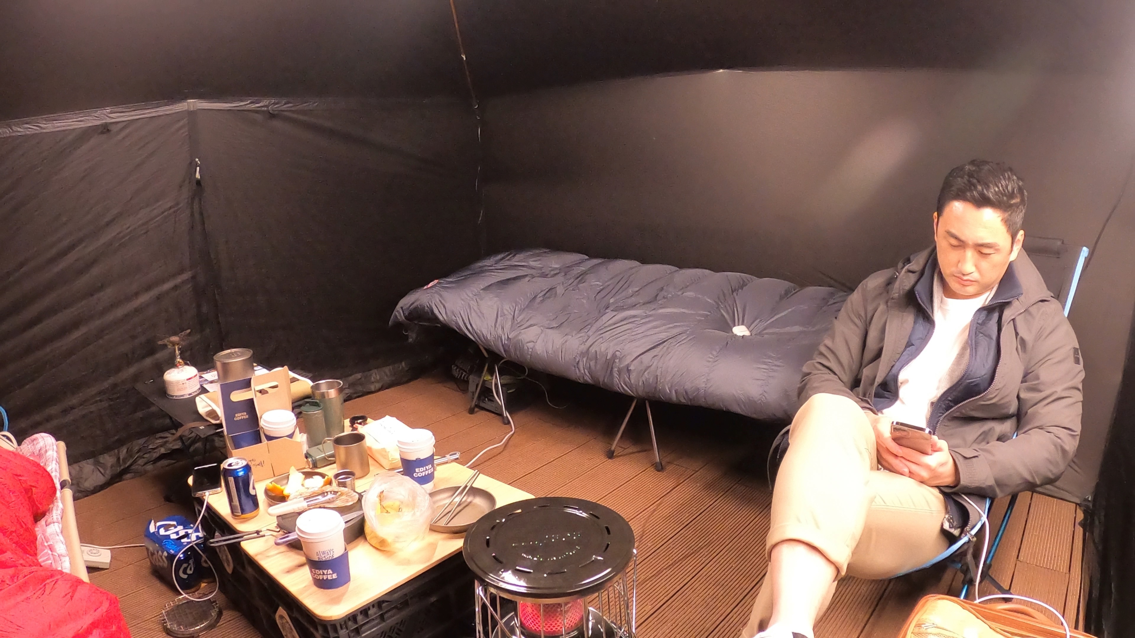야전침대 두개 위에는 140W 전기요를 덮었다.