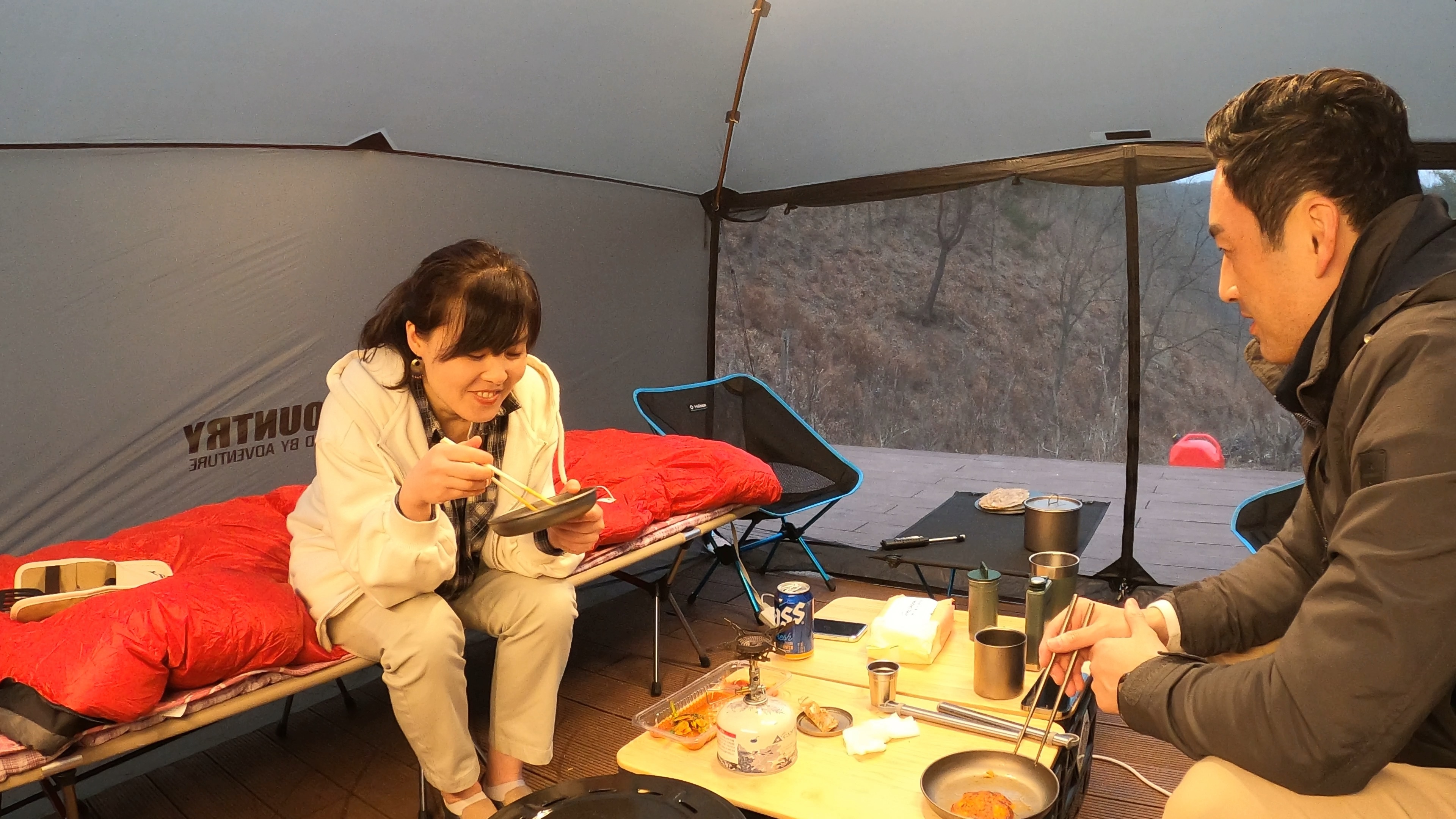 부부동반으로 간 캠핑에서는 항상 나는 텐트를 치고, 와이프는 체어와 야전침대 조립을 맡는다.